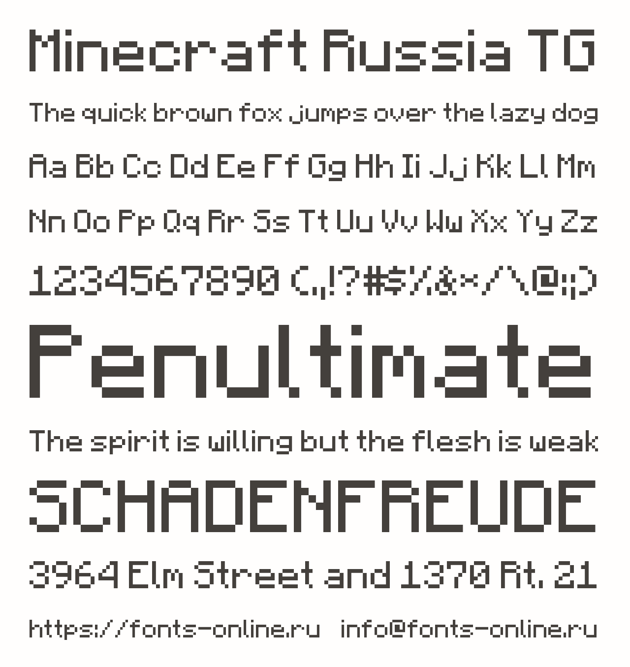 Minecraft Russia TG PinterestFacebookTwitter Скачать Minecraft Russia TG Тестировать Minecraft Russia TG Сообщить об ошибке Шрифт Minecraft Russia TG. Гарнитура содержит 1 файл и поддерживает 38 языков. Copyright Copyright © 2004-2012, BOGDAN Software Дополнительная информация Категории Брендовые шрифты Тематические шрифты Пиксельные шрифты Шрифты из игр Языки Албанский Английский Африкаанс Баскский Болгарский Бретонский Букмол Галисийский Датский Зулу Индонезийский Ирландский Испанский Итальянский Каталанский Кечуанский Корнский Люксембургский Малагасийский Мэнский Нидерландский Новонорвежский Оромо Португальский Романшский Руанда Рунди Русский Санго Северный ндебеле Сомалийский Суахили Узбекский Французский Чеченский Шведский Шона Шотландский
