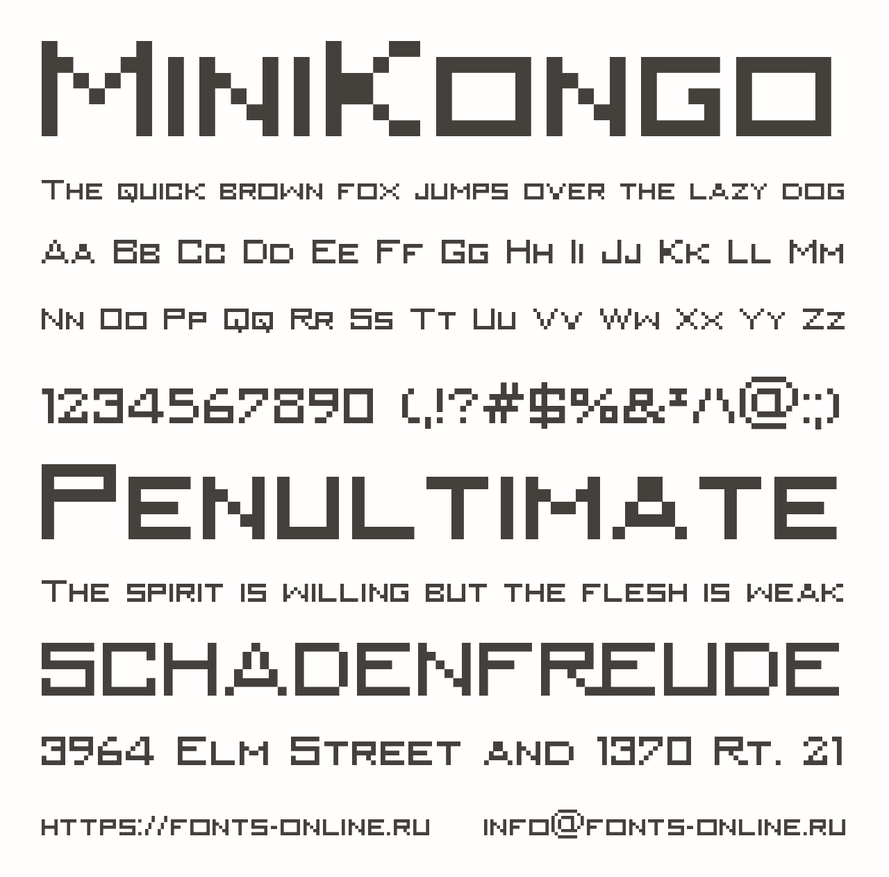 Шрифт MiniKongo. Гарнитура содержит 1 файл и поддерживает 13 языков. Можно использовать в не коммерческой деятельности. Разработка MiniKongo велась Nowak.tv.