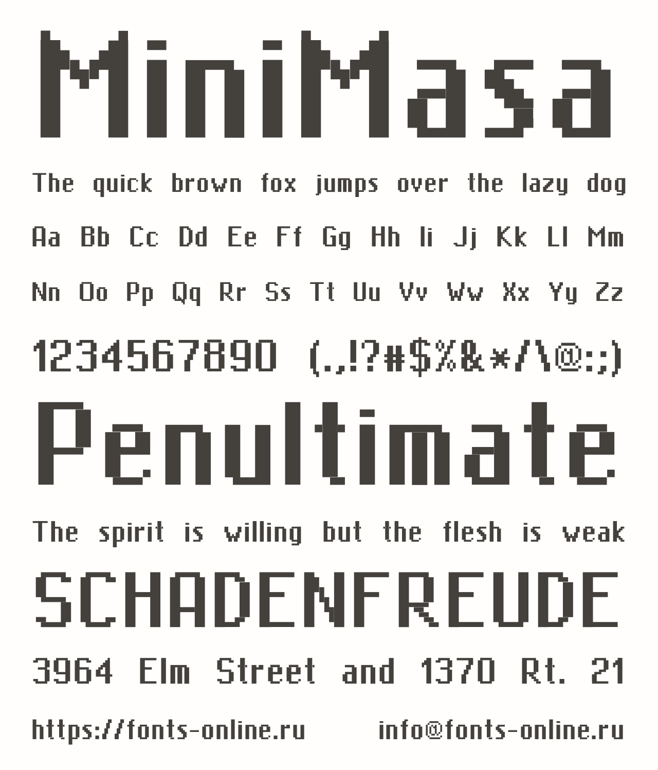 Шрифт MiniMasa. Гарнитура содержит 1 файл и поддерживает 13 языков. Можно использовать в не коммерческой деятельности. Разработка MiniMasa велась Nowak.tv.