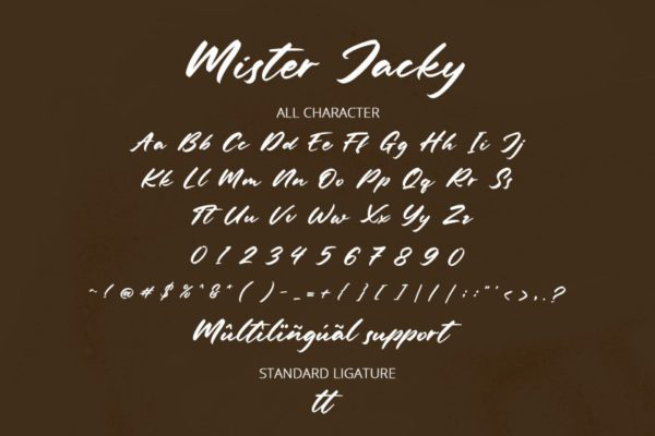 Шрифт Mister Jacky Personal Use. Гарнитура содержит 1 файл и поддерживает 36 языков. Можно использовать в не коммерческой деятельности. Разработка Mister Jacky Personal Use велась Din Studio.