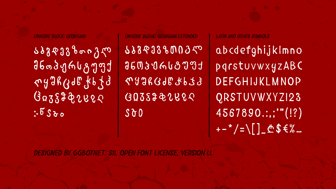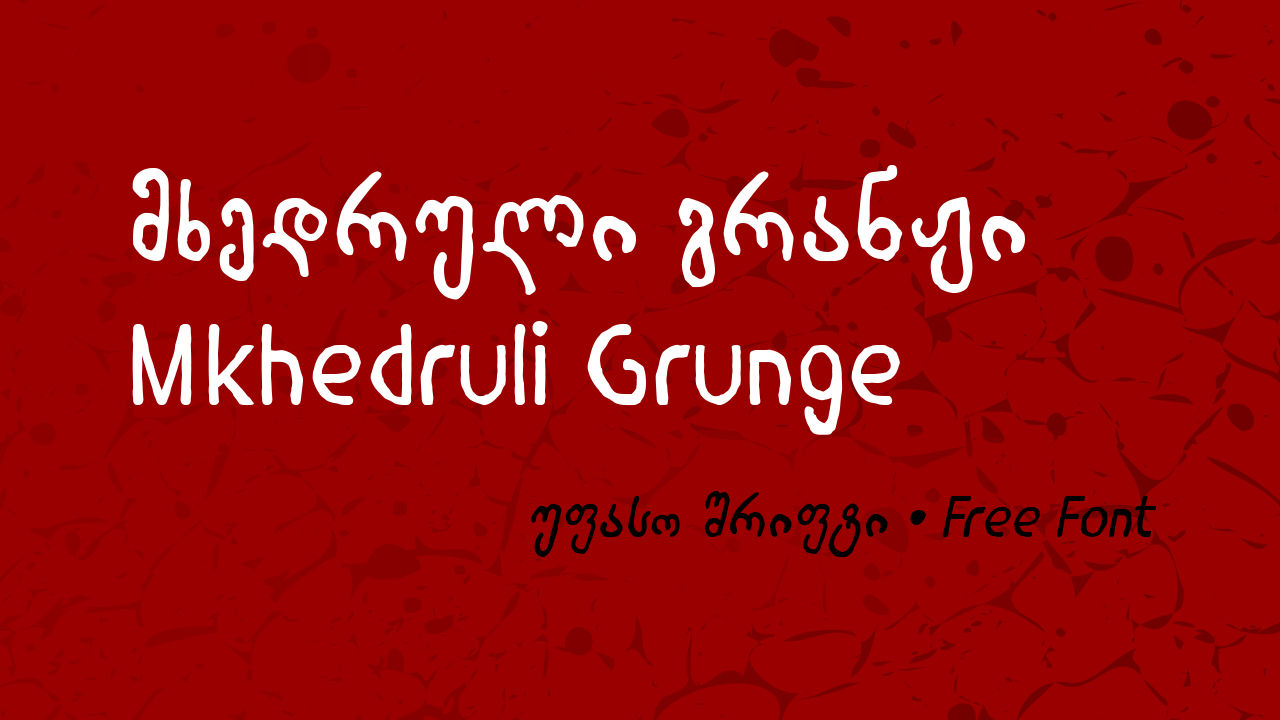 Шрифт Mkhedruli Grunge. Гарнитура содержит 2 файла и поддерживает 25 языков. Лицензия SIL OFL 1.1. Можно использовать в коммерческой и не коммерческой деятельности. Разработка Mkhedruli Grunge велась GGBotNet.