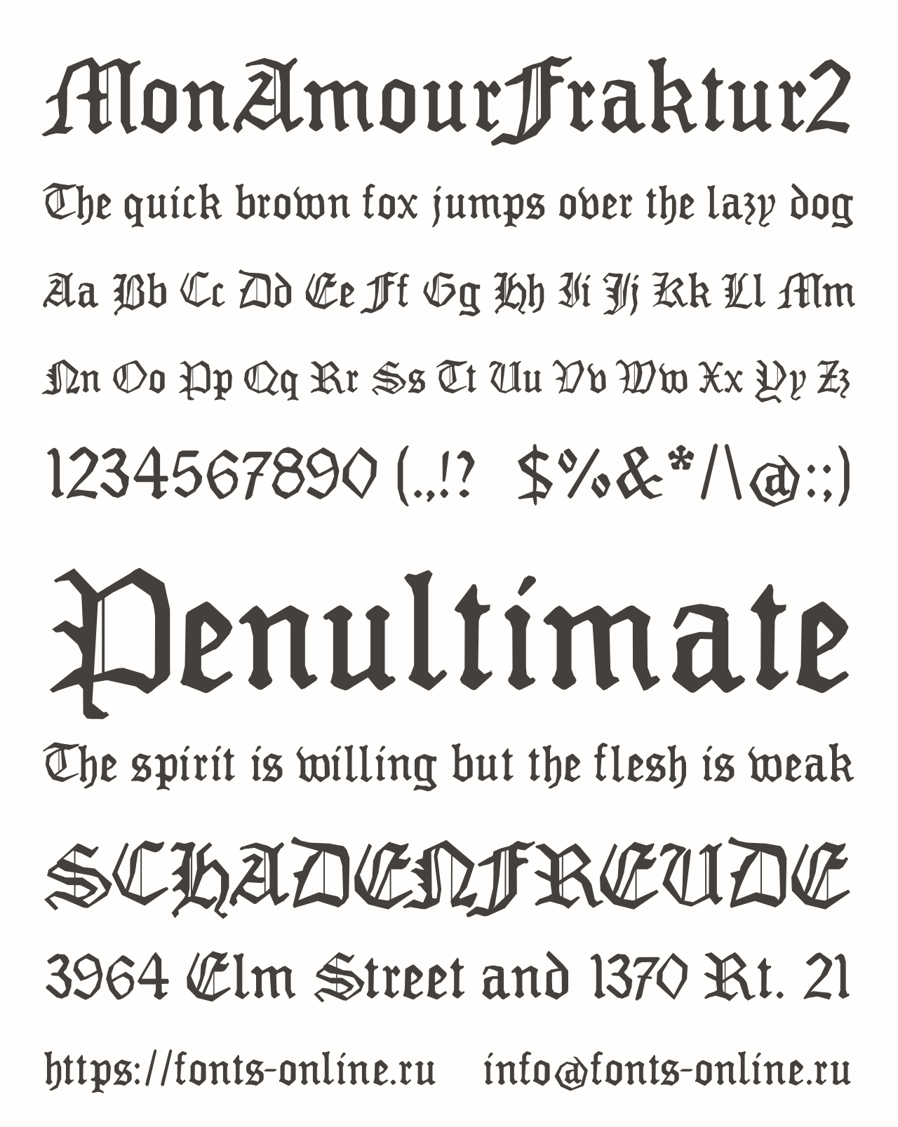 Шрифт MonAmourFraktur2. Гарнитура содержит 1 файл и поддерживает 13 языков. Можно использовать в не коммерческой деятельности.