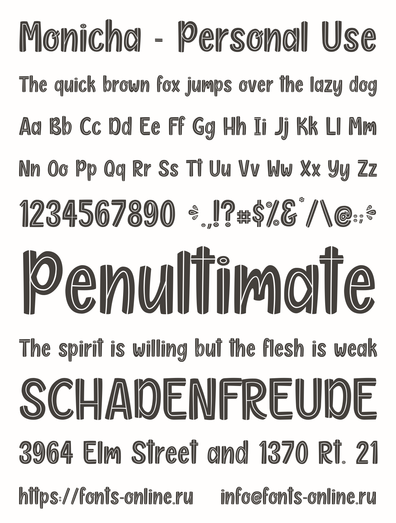 Шрифт Monicha - Personal Use. Гарнитура содержит 1 файл и поддерживает 35 языков. Можно использовать в не коммерческой деятельности. Разработка Monicha - Personal Use велась Typhoon Type� - Suthi Srisopha.