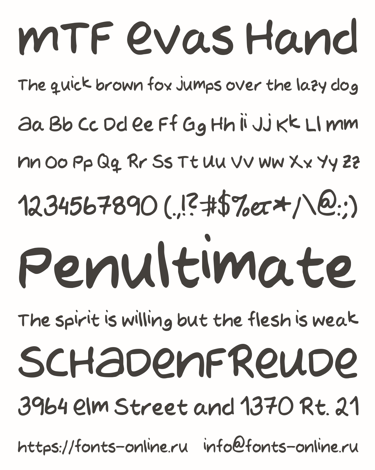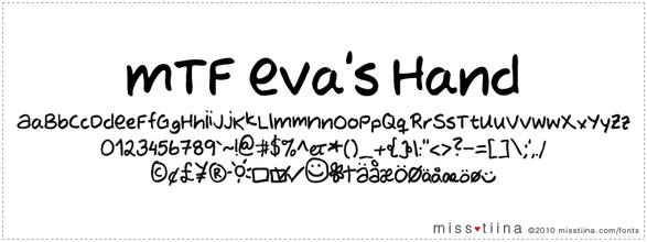 Шрифт MTF Evas Hand. Гарнитура содержит 1 файл и поддерживает 37 языков. Можно использовать в не коммерческой деятельности. Разработка MTF Evas Hand велась Miss Tiina Fonts - MTF.