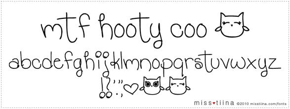 Шрифт MTF Hooty Coo. Гарнитура содержит 1 файл и поддерживает 37 языков. Можно использовать в не коммерческой деятельности. Разработка MTF Hooty Coo велась Miss Tiina Fonts - MTF.