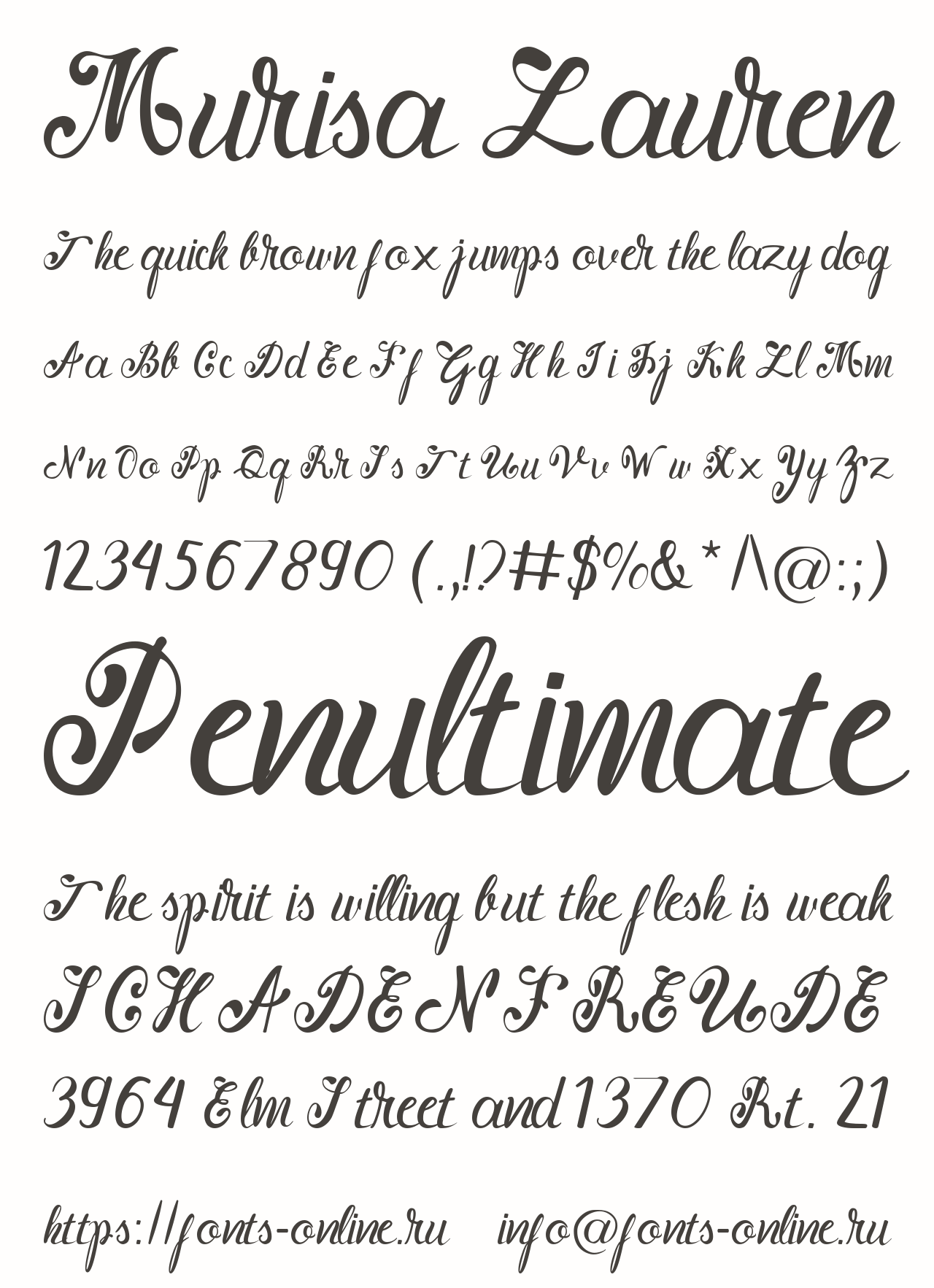 Шрифт Murisa Lauren. Гарнитура содержит 1 файл и поддерживает 12 языков. Можно использовать в не коммерческой деятельности.