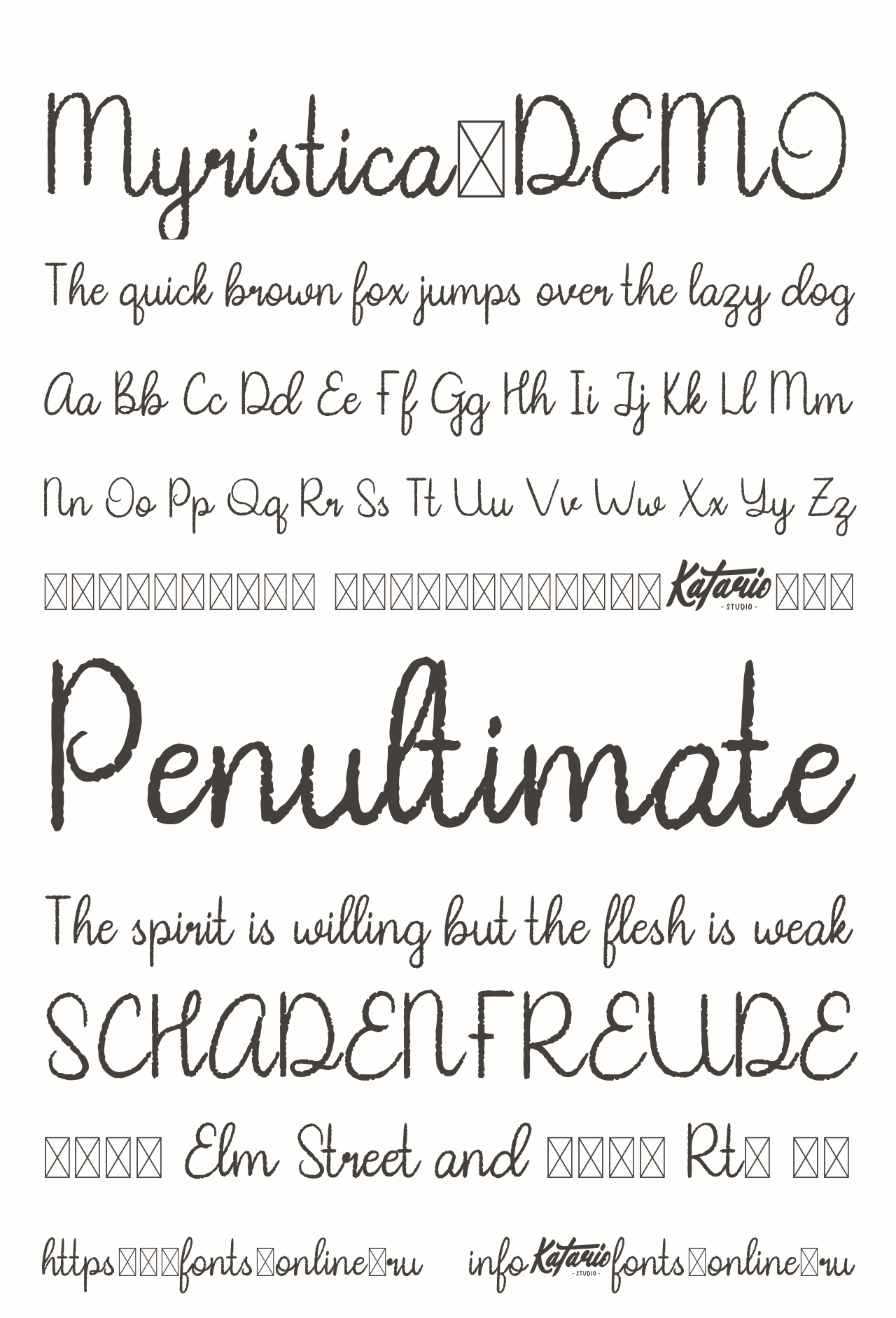 Шрифт Myristica-DEMO. Гарнитура содержит 1 файл и поддерживает 12 языков. Можно использовать в не коммерческой деятельности. Разработка Myristica-DEMO велась Katario Studio.