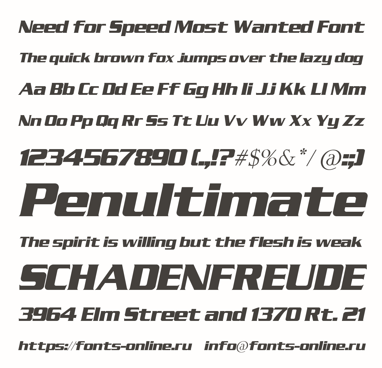 Need for Speed Most Wanted Font PinterestFacebookTwitter Скачать Need for Speed Most Wanted Font Тестировать Need for Speed Most Wanted Font Сообщить об ошибке Шрифт Need for Speed Most Wanted Font. Гарнитура содержит 2 файла и поддерживает 40 языков. Изображения Copyright Typeface © (your company). 2015. All Rights Reserved Дополнительная информация Категории Брендовые шрифты Тематические шрифты Шрифты из игр Языки Албанский Английский Африкаанс Баскский Болгарский Бретонский Букмол Галисийский Датский Зулу Индонезийский Ирландский Исландский Испанский Итальянский Каталанский Кечуанский Корнский Люксембургский Малагасийский Мэнский Немецкий Нидерландский Новонорвежский Оромо Португальский Романшский Руанда Рунди Русский Санго Северный ндебеле Сомалийский Суахили Узбекский Фарерский Чеченский Шведский Шона Шотландский
