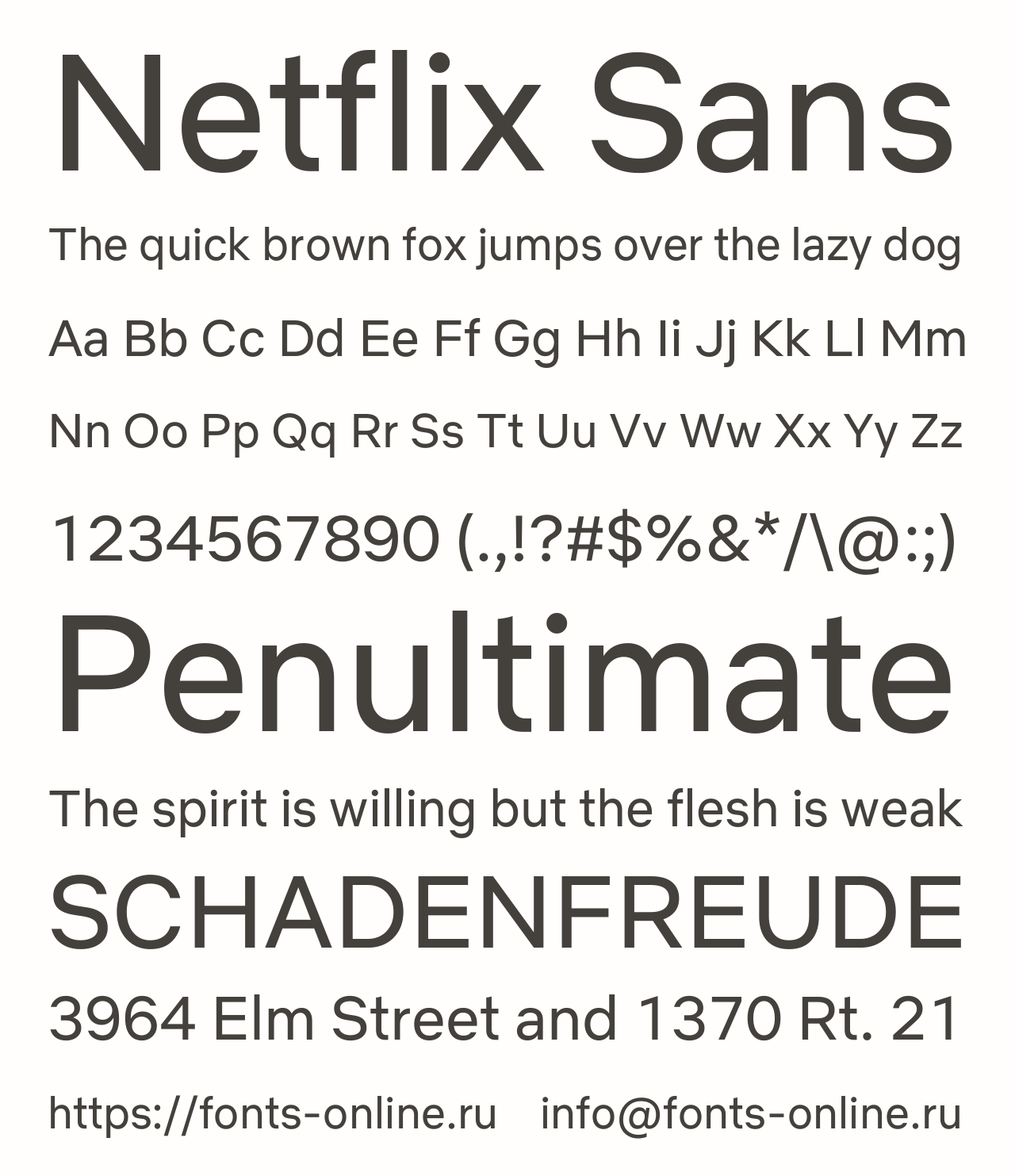 Netflix Sans PinterestFacebookTwitter Скачать Netflix Sans Тестировать Netflix Sans Сообщить об ошибке Шрифт Netflix Sans. Гарнитура содержит 12 файлов и поддерживает 78 языков. Copyright Copyright (c) 2018-2021. Netflix, Inc. and its affiliates. All rights reserved. Дополнительная информация Категории Тематические шрифты Брендовые шрифты Шрифты из фильмов Шрифты без засечек Шрифты для заголовков Языки Акан Албанский Английский Африкаанс Баскский Белорусский Болгарский Боснийский Бретонский Букмол Валлийский Венгерский Волапюк Вьетнамский Галисийский Гренландский Греческий Датский Западнофризский Зулу Игбо Индонезийский Ирландский Исландский Испанский Итальянский Йоруба Каталанский Кечуанский Кикуйю Корнский Латышский Лингала Литовский Луба-катанга Луганда Люксембургский Македонский Малагасийский Мальтийский Мэнский Немецкий Нидерландский Новонорвежский Оромо Осетинский Польский Португальский Романшский Руанда Румынский Рунди Русский Санго Северносаамский Северный ндебеле Сербский Словацкий Словенский Сомалийский Суахили Тонганский Турецкий Узбекский Украинский Фарерский Финский Французский Фула Хорватский Чеченский Чешский Шведский Шона Шотландский Эве Эсперанто Эстонский