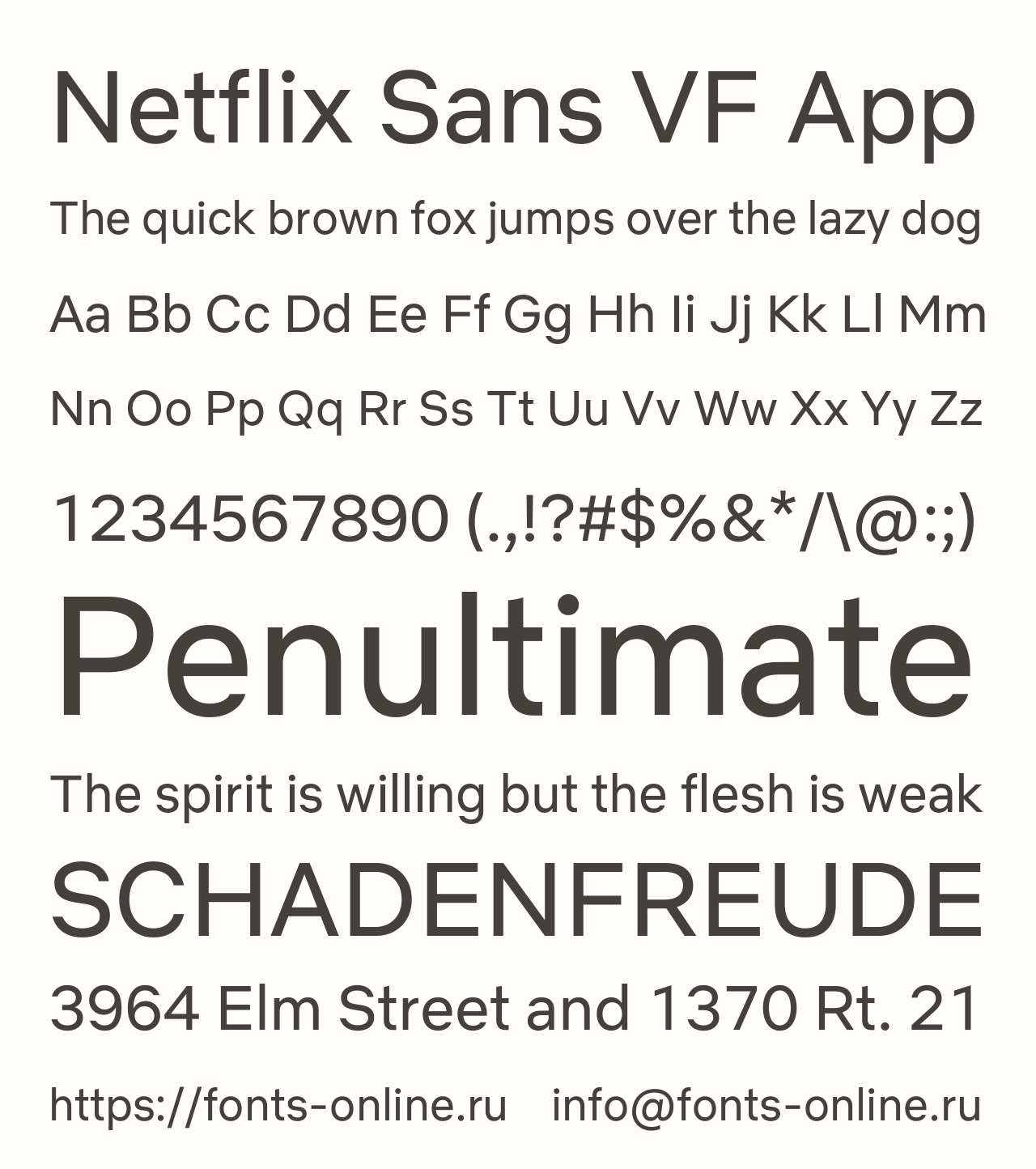 Netflix Sans VF App Вариативный шрифт PinterestFacebookTwitter Скачать Netflix Sans VF App Тестировать Netflix Sans VF App Сообщить об ошибке Netflix Sans VF App вариативный шрифт. Гарнитура содержит 3 файла и поддерживает 4 языка. Copyright Copyright (c) 2018-2021, 2025. Netflix, Inc. and its affiliates. All rights reserved. Дополнительная информация Категории Тематические шрифты Брендовые шрифты Шрифты без засечек Шрифты для заголовков Шрифты для текста Языки Арабский Персидский Пушту Урду