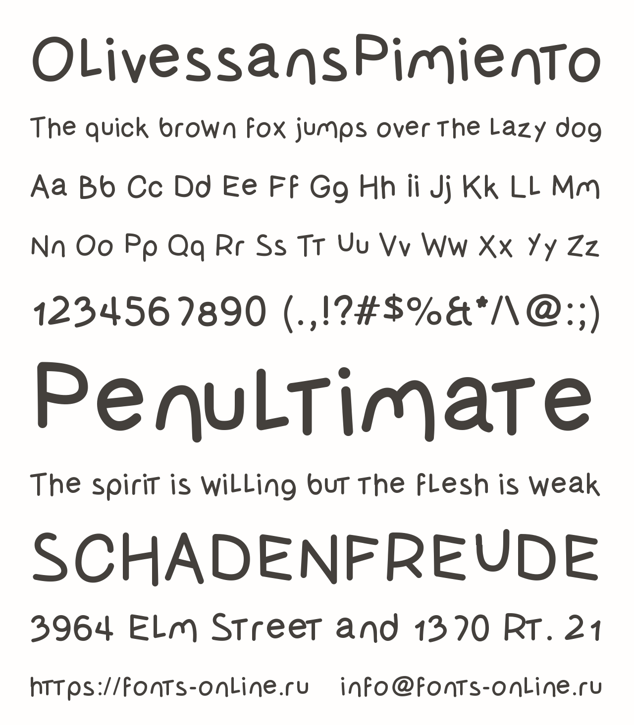 Шрифт OlivessansPimiento. Гарнитура содержит 3 файла и поддерживает 12 языков. Разработка OlivessansPimiento велась Shara Weber.
