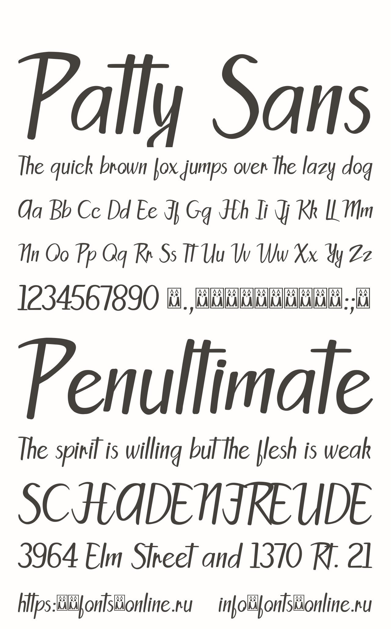 Шрифт Patty Sans. Гарнитура содержит 2 файла и поддерживает 12 языков. Можно использовать в не коммерческой деятельности. Разработка Patty Sans велась Jaime Rangel Castro.