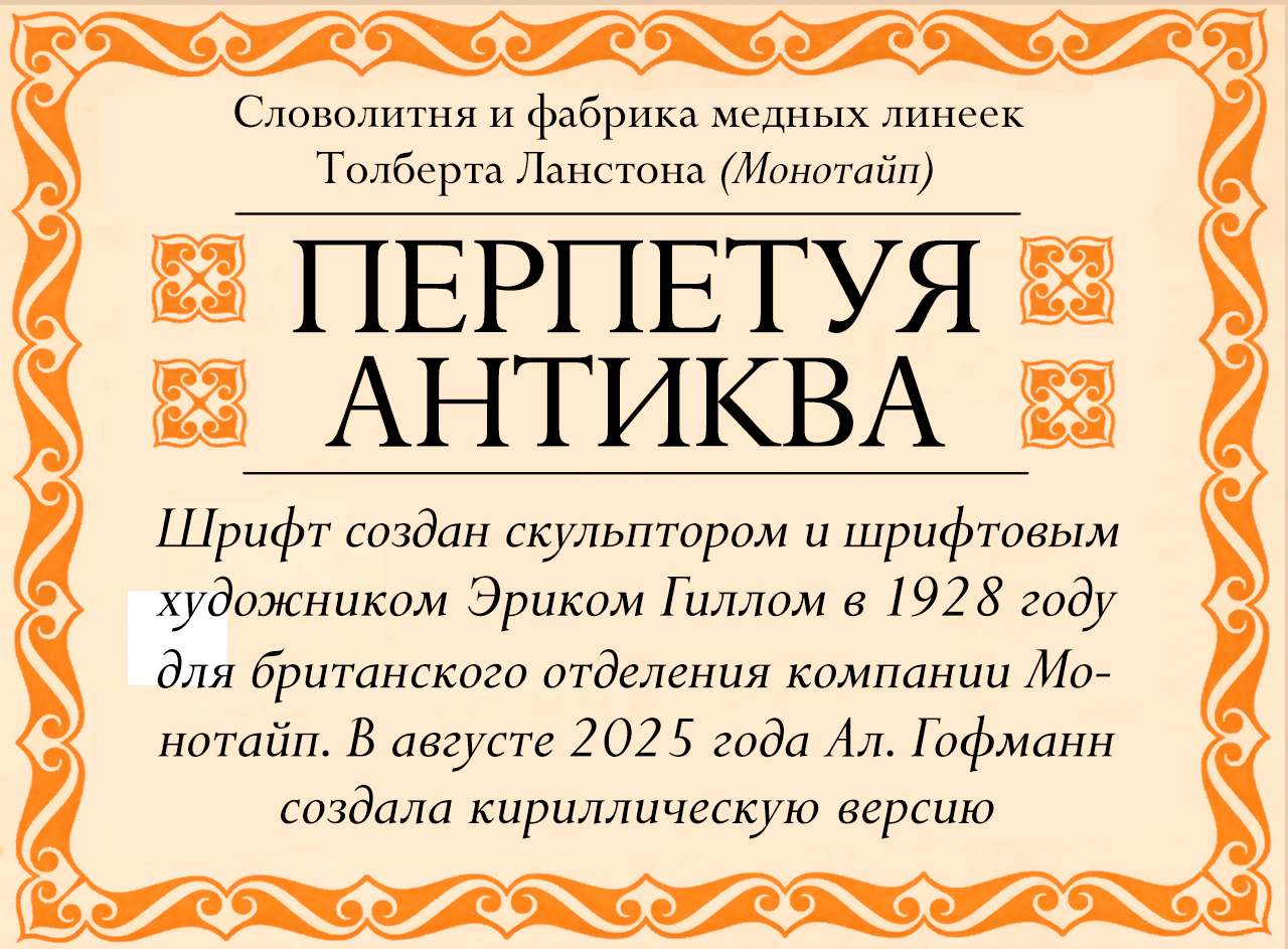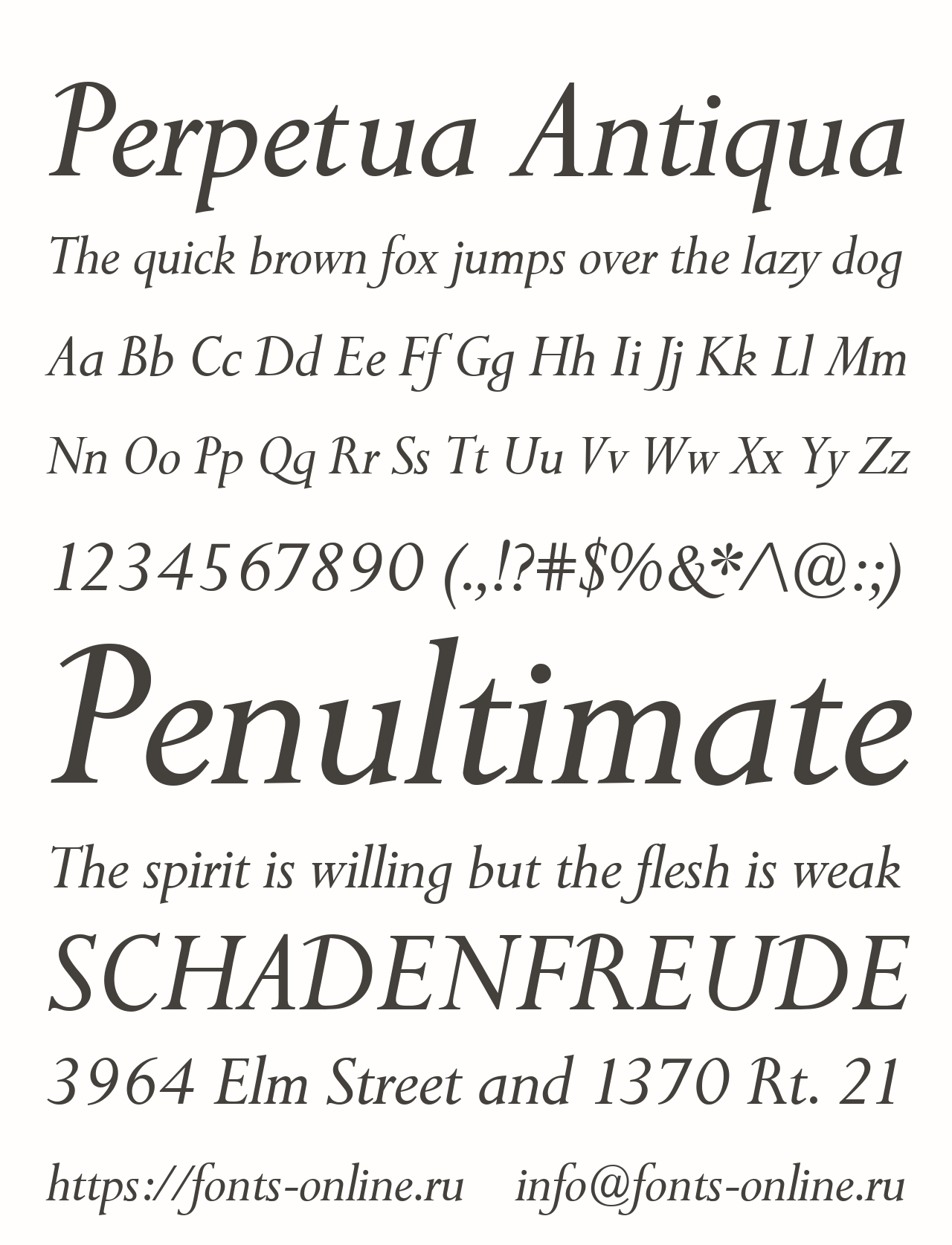 Шрифт Perpetua Antiqua. Гарнитура содержит 2 файла и поддерживает 74 языка. Можно использовать в не коммерческой деятельности. Разработка Perpetua Antiqua велась Alexandra Gophmann.