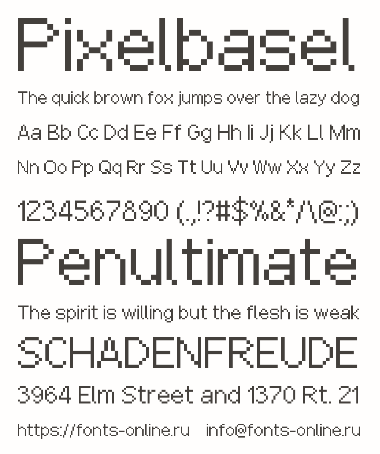 Pixelbasel PinterestFacebookTwitter Скачать Pixelbasel Тестировать Pixelbasel Сообщить об ошибке Шрифт Pixelbasel. Гарнитура содержит 1 файл и поддерживает 61 язык. Разработка Pixelbasel велась GGBotNet. Изображения Copyright GGBotNet Дизайнеры GGBotNet Дополнительная информация Категории Тематические шрифты Пиксельные шрифты Языки Акан Албанский Английский Африкаанс Баскский Бретонский Букмол Венгерский Волапюк Галисийский Гренландский Датский Западнофризский Зулу Индонезийский Ирландский Исландский Испанский Итальянский Каталанский Кечуанский Кикуйю Корнский Латышский Литовский Луба-катанга Луганда Люксембургский Малагасийский Мальтийский Мэнский Немецкий Нидерландский Новонорвежский Оромо Польский Португальский Романшский Руанда Румынский Рунди Санго Северносаамский Северный ндебеле Словацкий Словенский Сомалийский Суахили Тонганский Турецкий Узбекский Фарерский Финский Французский Хорватский Чешский Шведский Шона Шотландский Эсперанто Эстонский