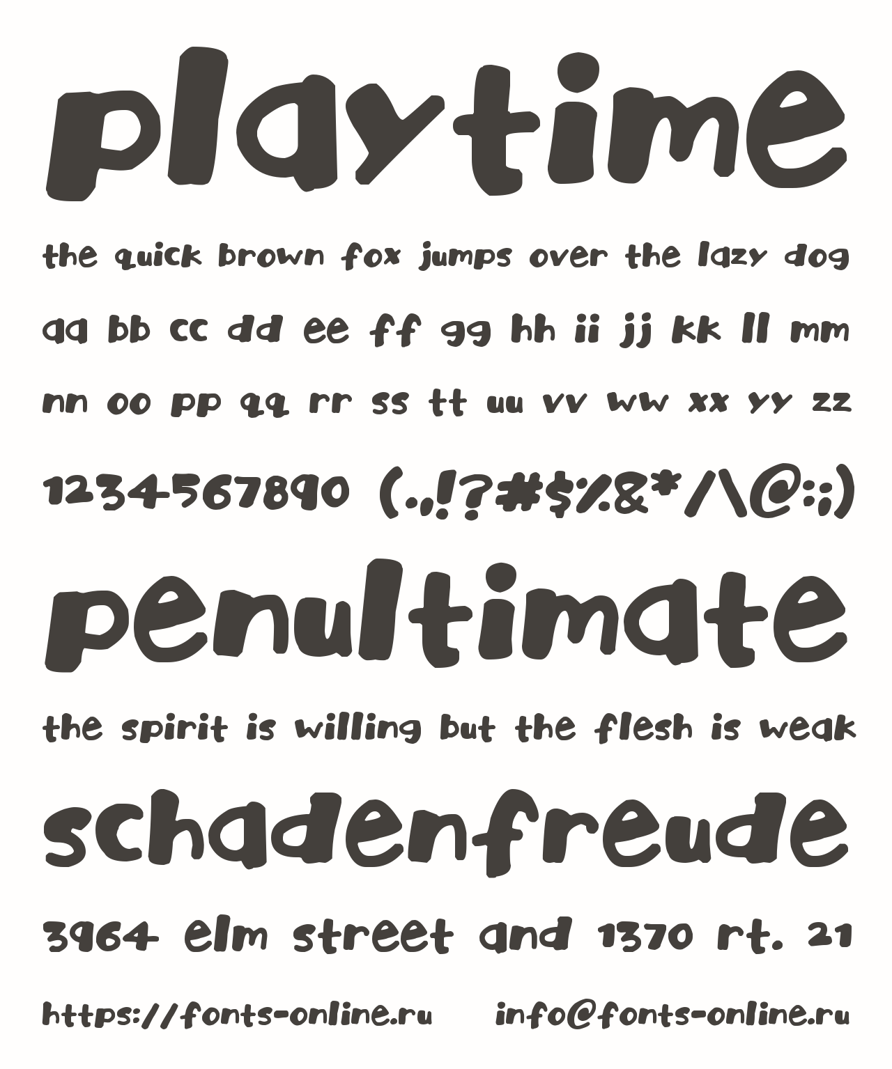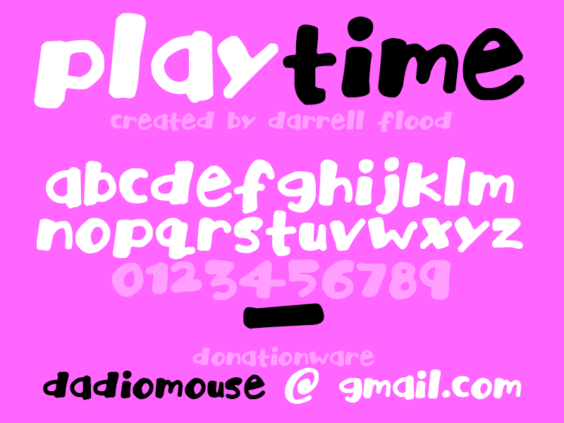Шрифт Playtime. Гарнитура содержит 1 файл и поддерживает 0 языков. Разработка Playtime велась Darrell Flood.
