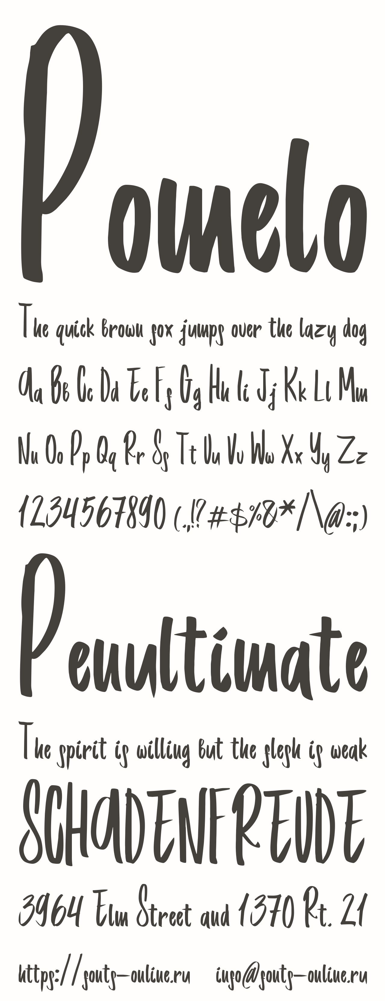 Pomelo PinterestFacebookTwitter Скачать Pomelo Тестировать Pomelo Сообщить об ошибке Шрифт Pomelo. Гарнитура содержит 2 файла и поддерживает 32 языка. Изображения Дополнительная информация Категории Рукописные шрифты Каллиграфические шрифты Маркер шрифты Скетч шрифты Школьные шрифты Шрифты кисти Языки Албанский Английский Африкаанс Баскский Болгарский Бретонский Галисийский Зулу Индонезийский Ирландский Испанский Итальянский Кечуанский Корнский Люксембургский Малагасийский Мэнский Немецкий Нидерландский Оромо Португальский Романшский Руанда Рунди Санго Северный ндебеле Сомалийский Суахили Узбекский Шведский Шона Шотландский