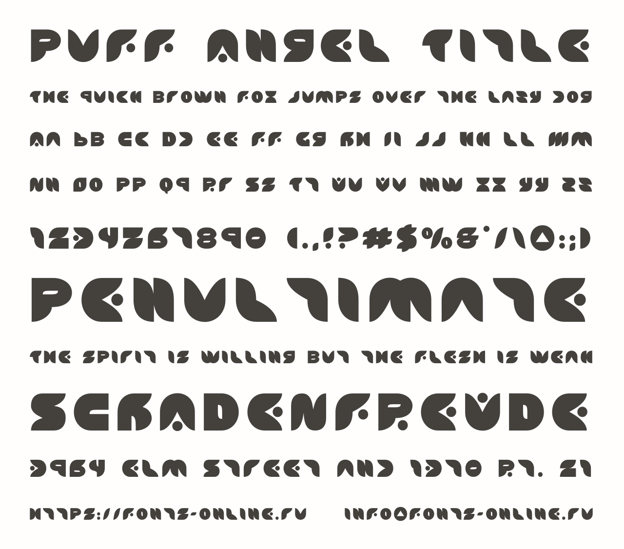 Шрифт Puff Angel Title. Гарнитура содержит 42 файла и поддерживает 41 язык. Разработка Puff Angel Title велась Iconian Fonts.