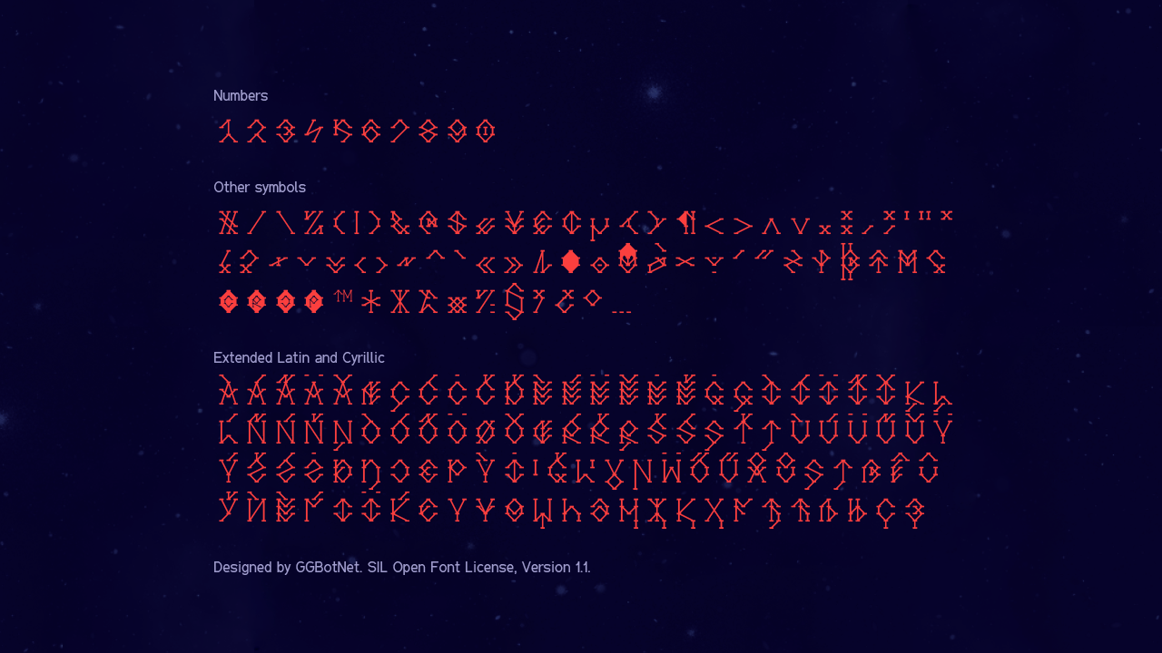 Шрифт Pulstar. Гарнитура содержит 2 файла и поддерживает 12 языков. Лицензия SIL OFL 1.1. Можно использовать в коммерческой и не коммерческой деятельности. Разработка Pulstar велась GGBotNet.