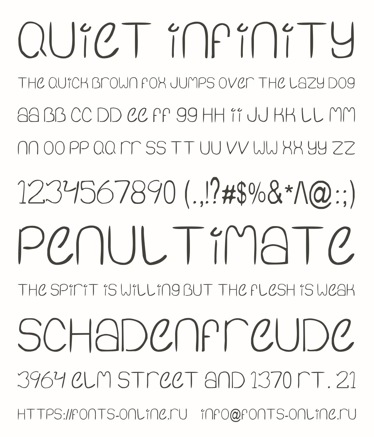 Шрифт Quiet Infinity. Гарнитура содержит 1 файл и поддерживает 12 языков. Можно использовать в коммерческой и не коммерческой деятельности.