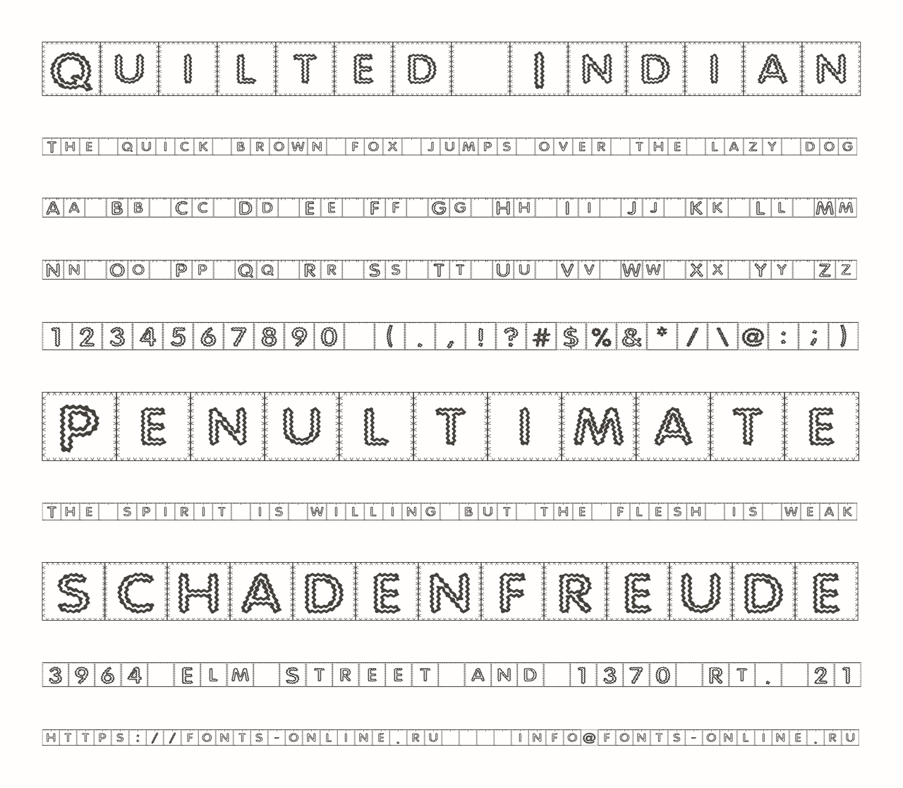 Шрифт Quilted Indian. Гарнитура содержит 1 файл и поддерживает 12 языков. Можно использовать в коммерческой и не коммерческой деятельности.