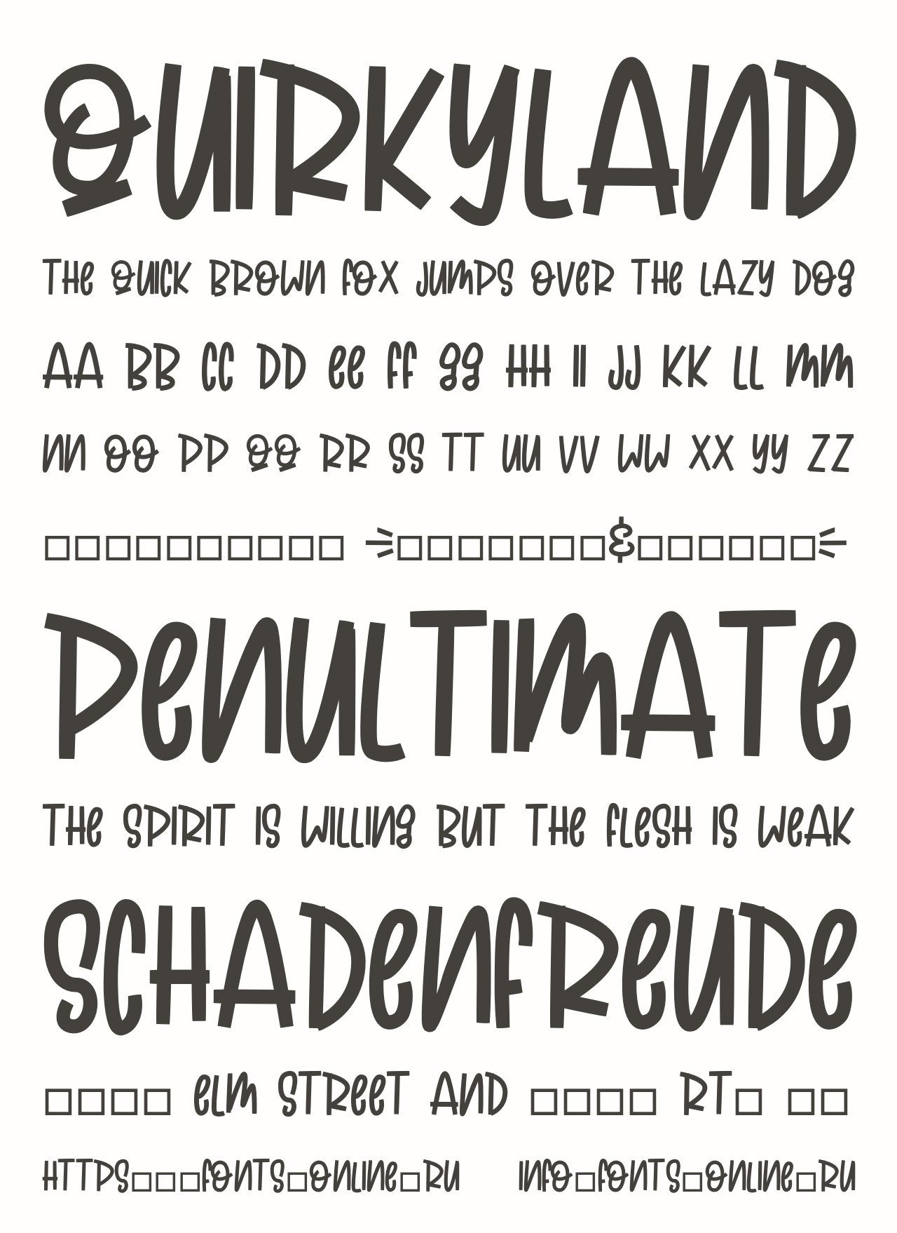 Шрифт QUIRKYLAND. Гарнитура содержит 2 файла и поддерживает 12 языков. Можно использовать в не коммерческой деятельности. Разработка QUIRKYLAND велась selawetype.