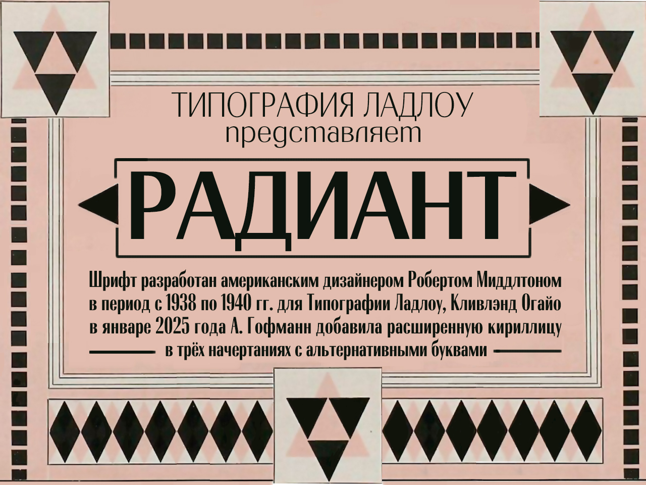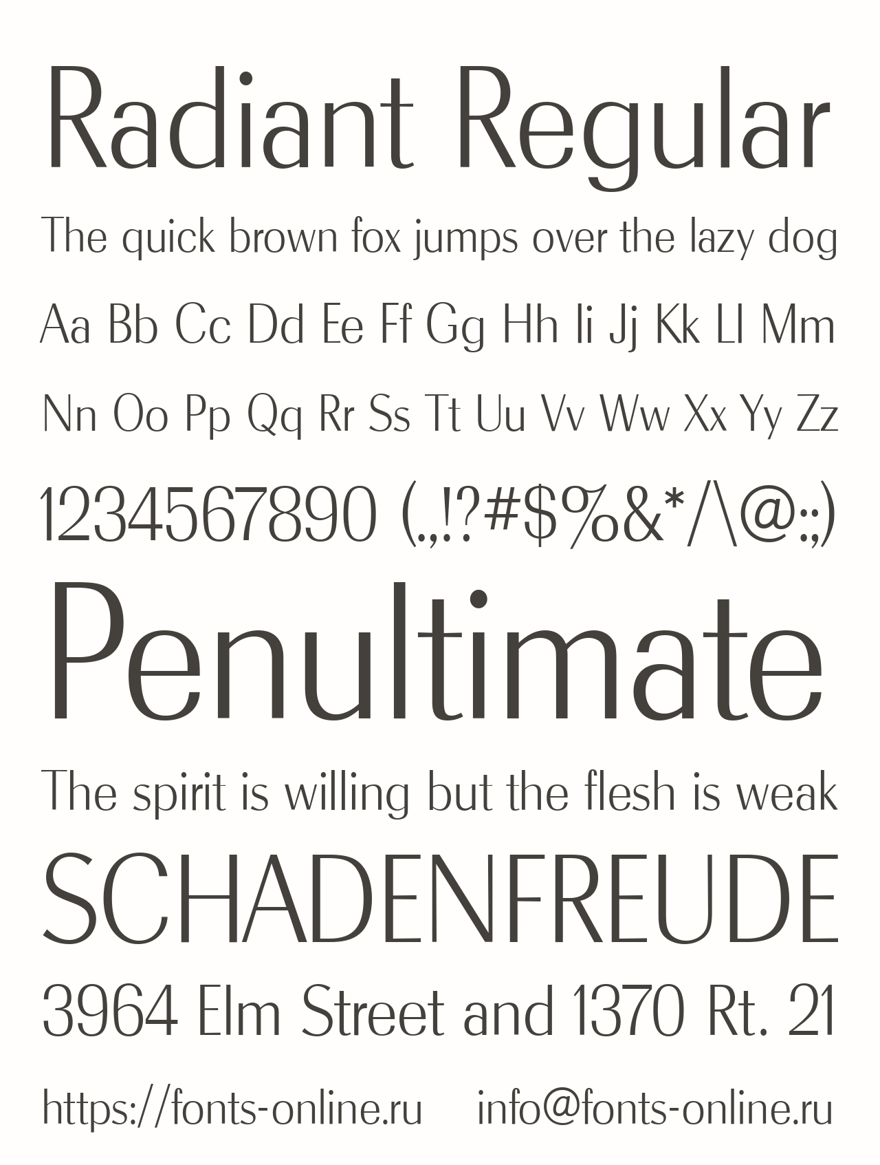 Шрифт Radiant Regular. Гарнитура содержит 6 файлов и поддерживает 74 языка. Можно использовать в не коммерческой деятельности. Разработка Radiant Regular велась Alexandra Gophmann.