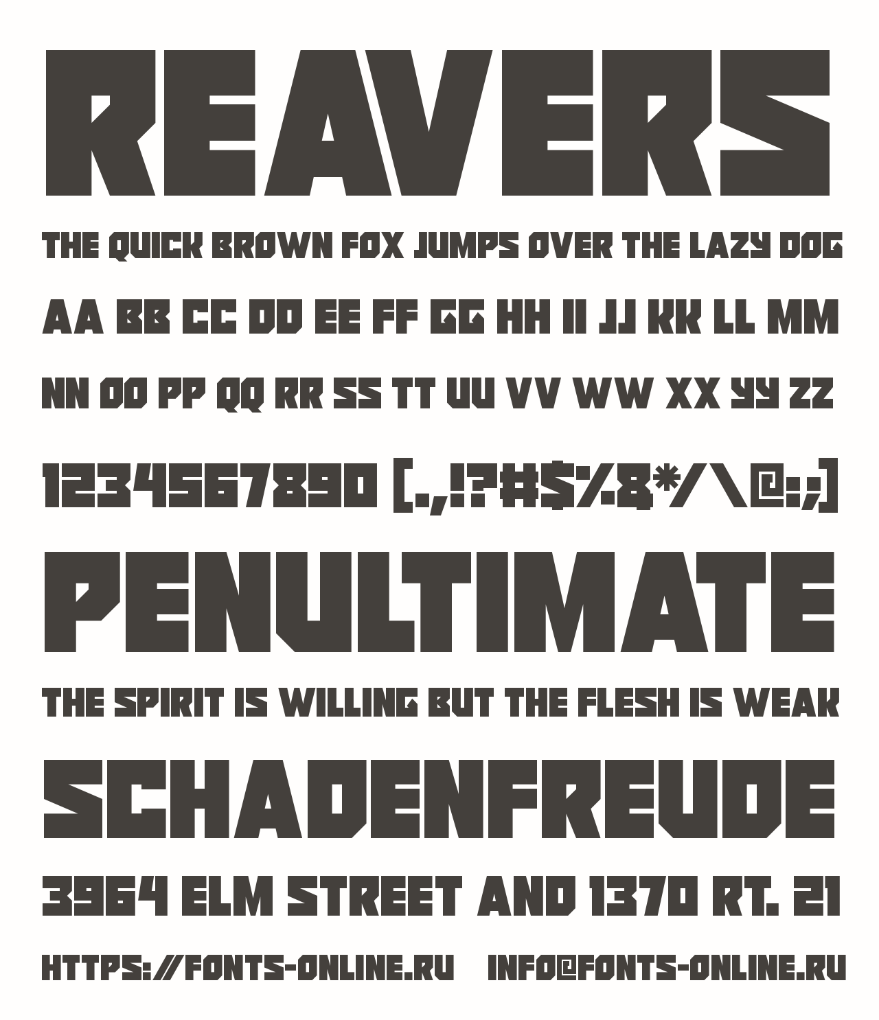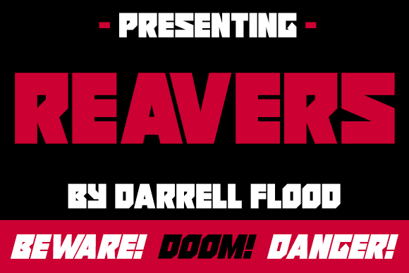 Шрифт Reavers. Гарнитура содержит 4 файла и поддерживает 12 языков. Разработка Reavers велась Darrell Flood.