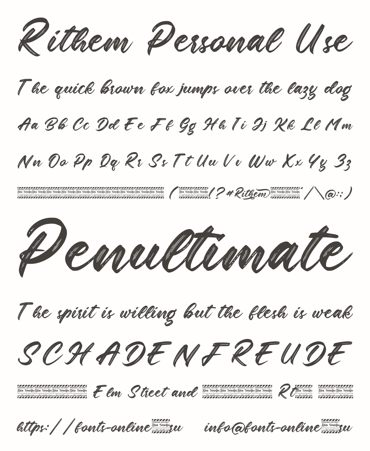 Шрифт Rithem Personal Use. Гарнитура содержит 1 файл и поддерживает 36 языков. Можно использовать в не коммерческой деятельности. Разработка Rithem Personal Use велась Din Studio.
