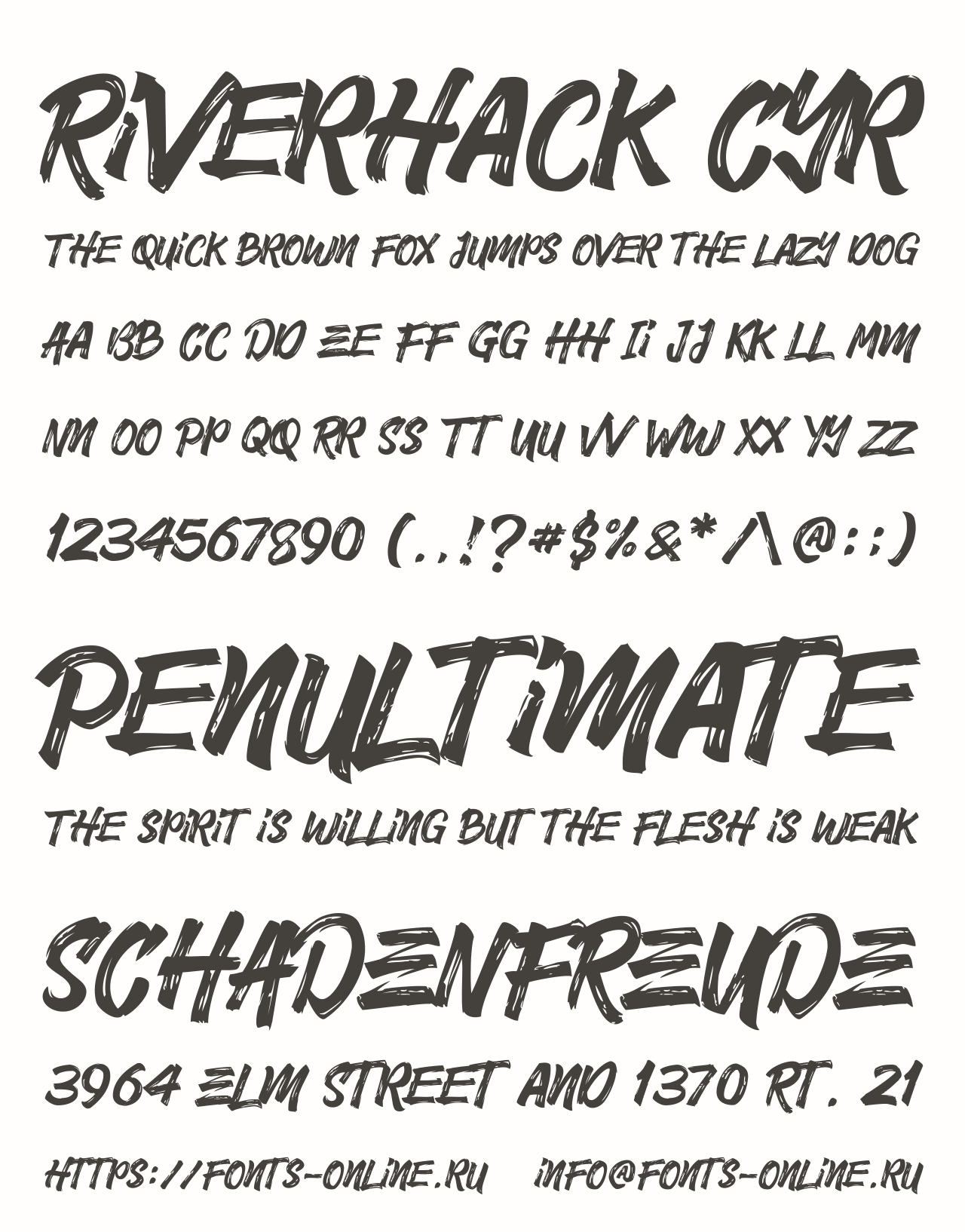 Riverhack Сyr PinterestFacebookTwitter Скачать Riverhack Сyr Тестировать Riverhack Сyr Сообщить об ошибке Шрифт Riverhack Сyr. Гарнитура содержит 2 файла и поддерживает 13 языков. Изображения Дополнительная информация Категории Рукописные шрифты Граффити шрифты Маркер шрифты Скетч шрифты Школьные шрифты Шрифты кисти Языки Английский Болгарский Зулу Индонезийский Корнский Оромо Руанда Рунди Северный ндебеле Сомалийский Суахили Узбекский Шона