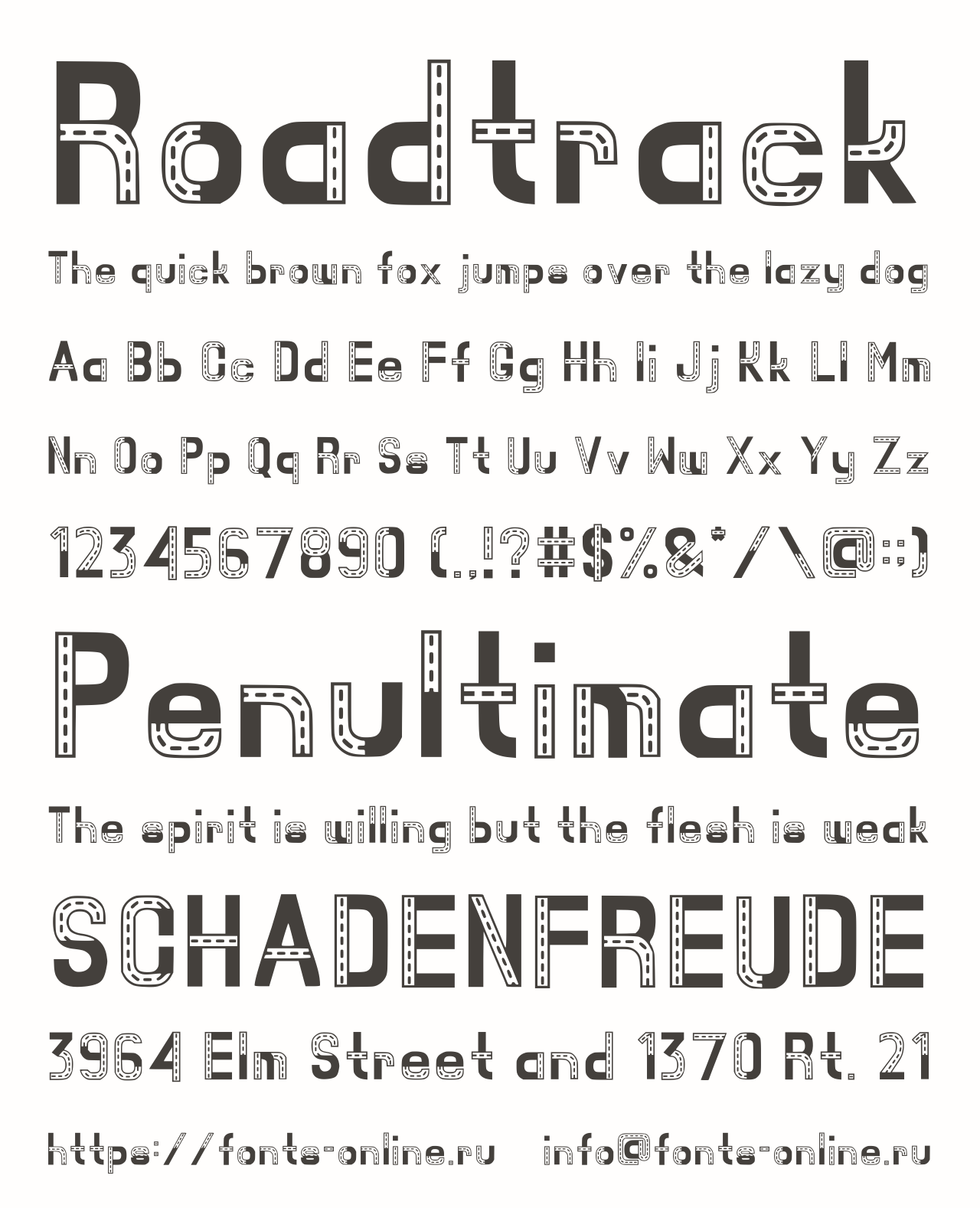 Шрифт Roadtrack. Гарнитура содержит 1 файл и поддерживает 12 языков. Можно использовать в не коммерческой деятельности. Разработка Roadtrack велась Sherleen Christie Soetanto.