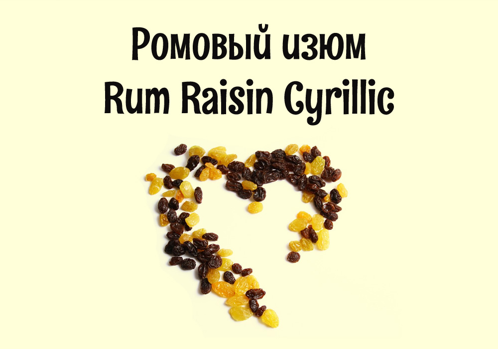 Шрифт Rum Raisin Cyrillic. Гарнитура содержит 1 файл и поддерживает 61 язык. Лицензия SIL OFL 1.1. Можно использовать в коммерческой и не коммерческой деятельности. Разработка Rum Raisin Cyrillic велась Denis Ignatov.