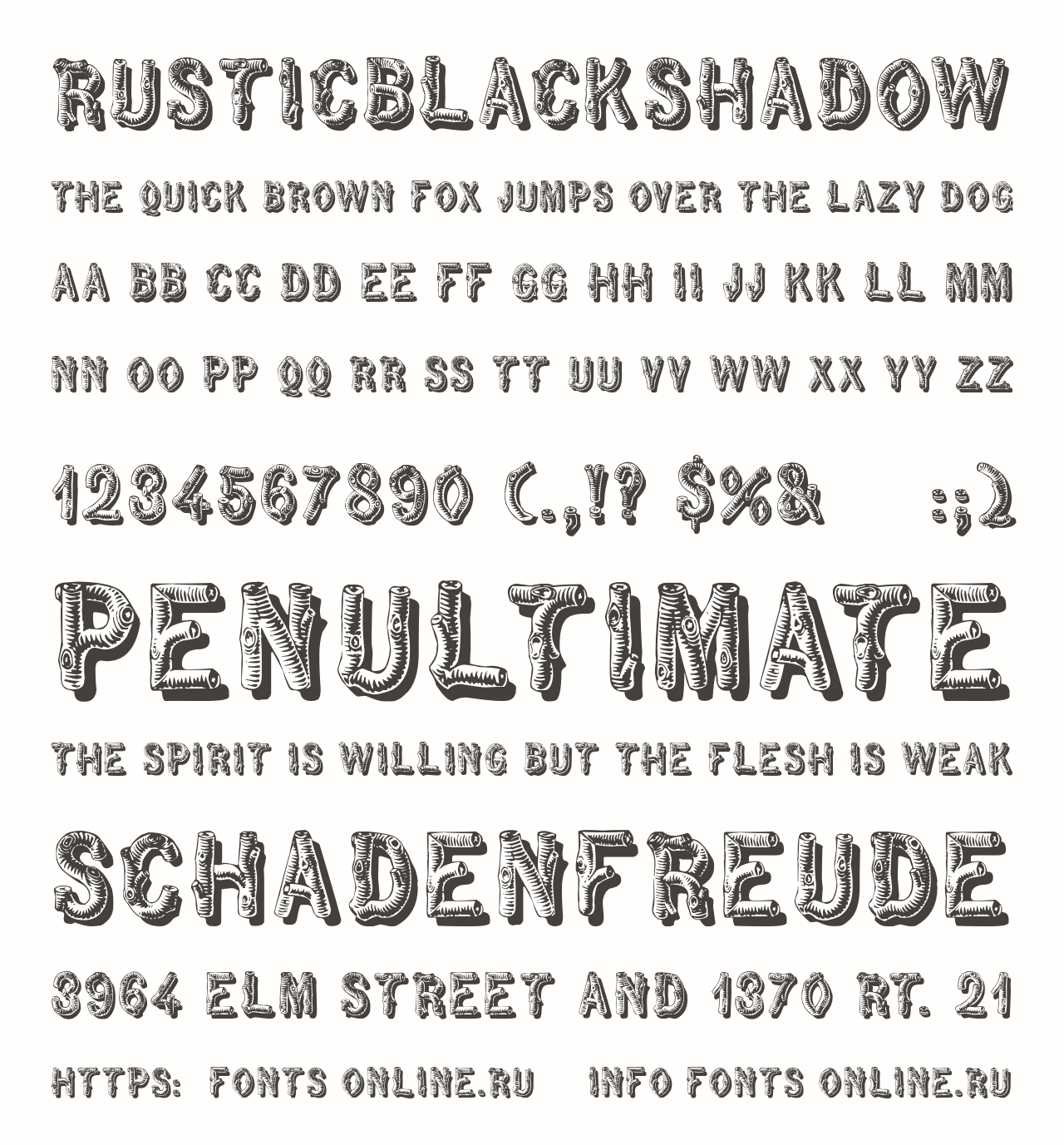 Шрифт RusticBlackShadow. Гарнитура содержит 2 файла и поддерживает 12 языков. Можно использовать в коммерческой и не коммерческой деятельности.
