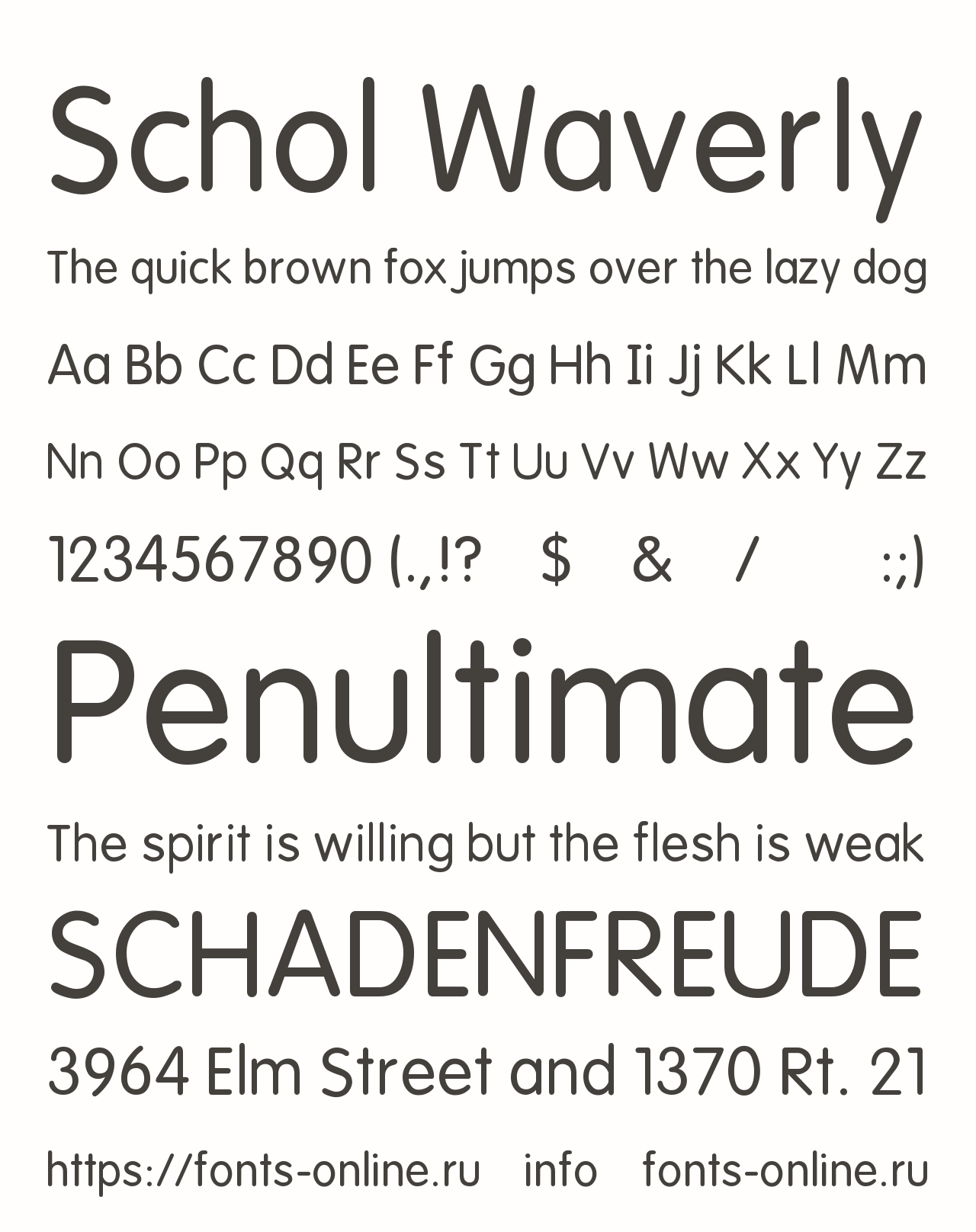 Schol Waverly PinterestFacebookTwitter Скачать Schol Waverly Тестировать Schol Waverly Сообщить об ошибке Шрифт Schol Waverly. Гарнитура содержит 2 файла и поддерживает 29 языков. Copyright (c) 1993 Lazy Dog Foundry, Inc. All rights reserved. Дополнительная информация Категории Тематические шрифты Альтернативные шрифты Шрифты без засечек Шрифты для заголовков Шрифты для текста Языки Албанский Английский Африкаанс Баскский Бретонский Галисийский Зулу Индонезийский Ирландский Испанский Итальянский Кечуанский Корнский Люксембургский Малагасийский Мэнский Нидерландский Оромо Португальский Романшский Руанда Рунди Санго Северный ндебеле Сомалийский Суахили Узбекский Шона Шотландский