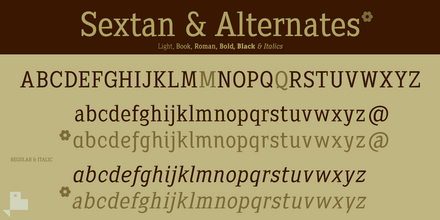 Sextan is a Serif typeface family with 10 styles designed especially for editorial design and publications in general. The proportions of the font as well as the metrics and the kerning have been carefully calculated to obtain maximum readability. The fonts also have a complete set of lowercase alternatives and advanced OpenType features