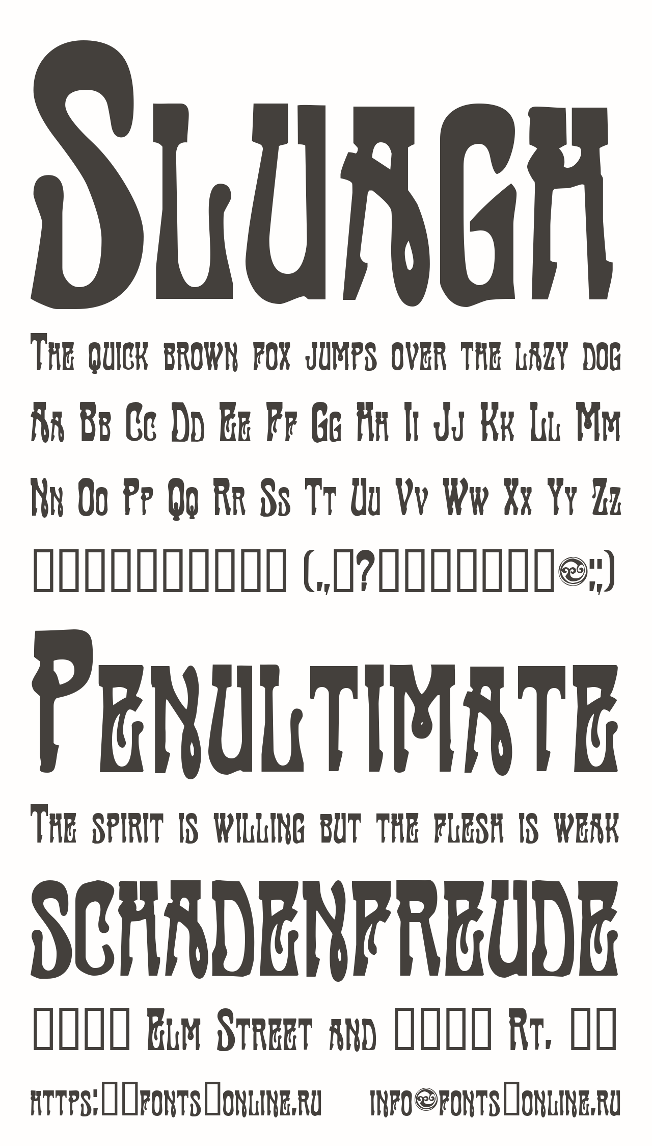Шрифт Sluagh. Гарнитура содержит 1 файл и поддерживает 12 языков. Можно использовать в коммерческой и не коммерческой деятельности.