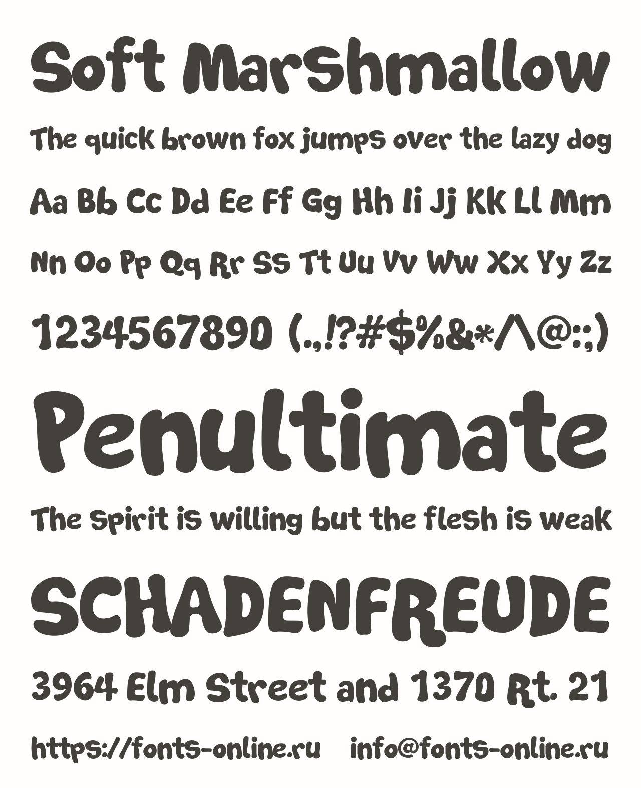 Шрифт Soft Marshmallow. Гарнитура содержит 1 файл и поддерживает 37 языков. Можно использовать в не коммерческой деятельности. Разработка Soft Marshmallow велась Galdino Otten.