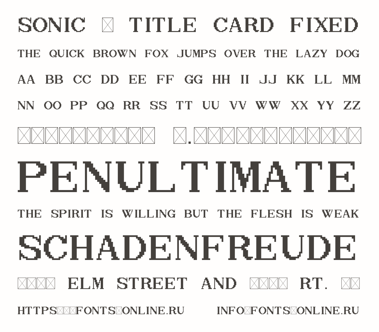 Sonic 1 Title Card Fixed PinterestFacebookTwitter Скачать Sonic 1 Title Card Fixed Тестировать Sonic 1 Title Card Fixed Сообщить об ошибке Шрифт Sonic 1 Title Card Fixed. Гарнитура содержит 1 файл и поддерживает 12 языков. Описание FONT NOT APPROVED BY SEGA Copyright “Sonic 1 Title Card Дополнительная информация Категории Пиксельные шрифты Тематические шрифты Шрифты из игр Языки Английский Зулу Индонезийский Корнский Оромо Руанда Рунди Северный ндебеле Сомалийский Суахили Узбекский Шона