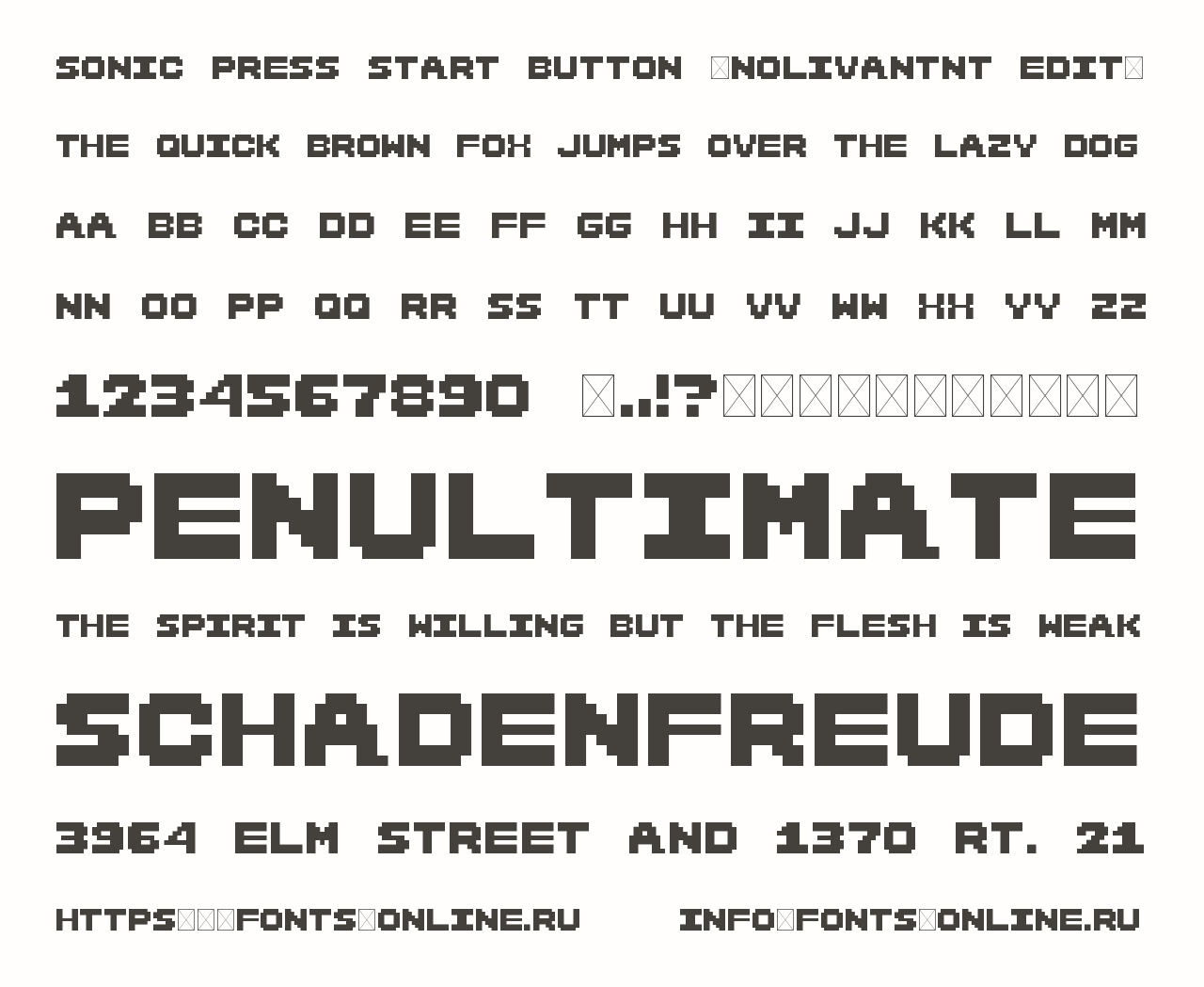 Sonic Press Start Button [NolivantNT Edit] PinterestFacebookTwitter Скачать Sonic Press Start Button [NolivantNT Edit] Тестировать Sonic Press Start Button [NolivantNT Edit] Сообщить об ошибке Шрифт Sonic Press Start Button [NolivantNT Edit]. Гарнитура содержит 1 файл и поддерживает 16 языков. Copyright Copyright Logan2020 2022 Дополнительная информация Категории Тематические шрифты Заглавные шрифты Пиксельные шрифты Шрифты из игр Языки Английский Белорусский Болгарский Зулу Индонезийский Корнский Оромо Руанда Рунди Русский Северный ндебеле Сомалийский Суахили Узбекский Чеченский Шона