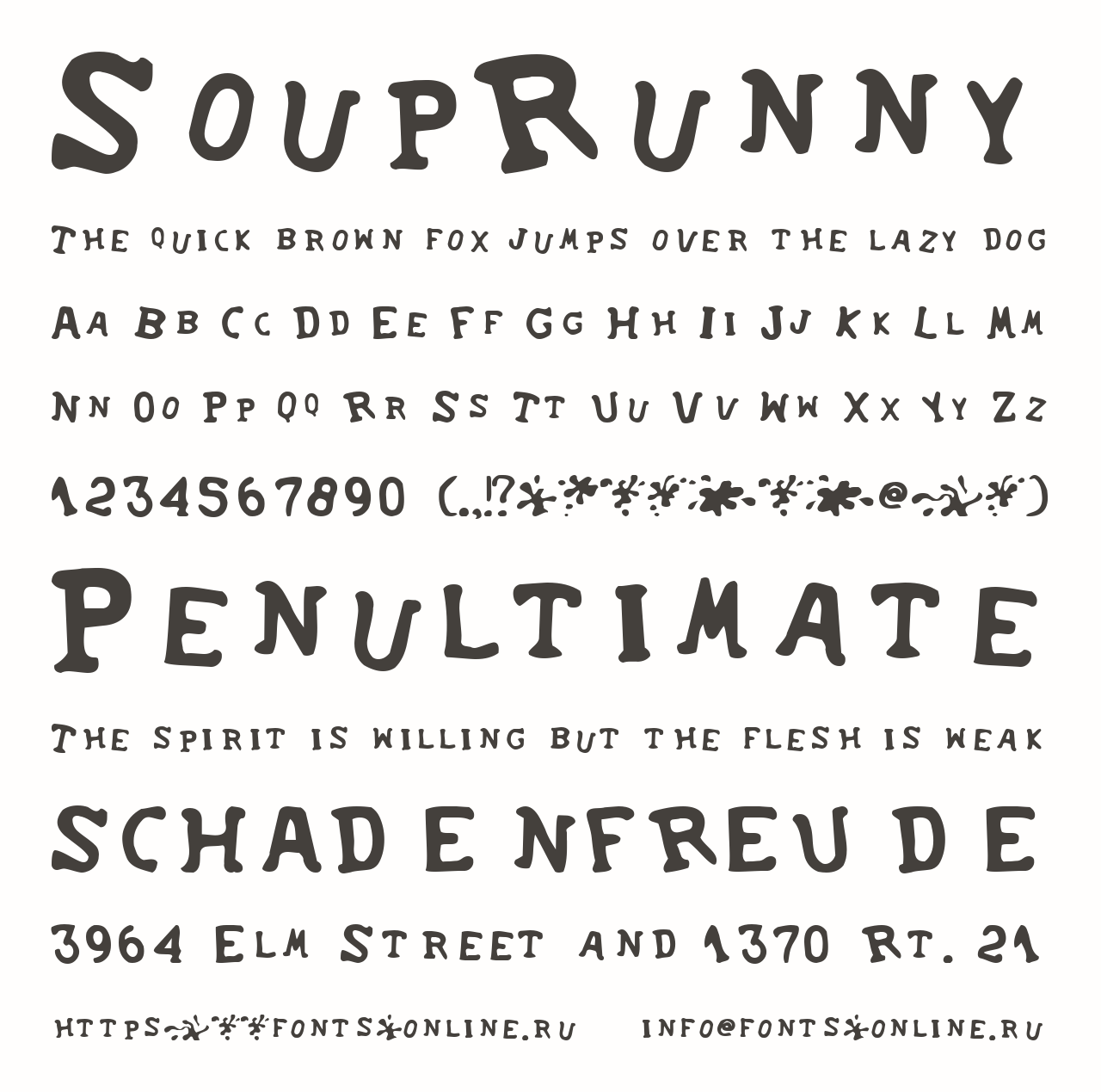 Шрифт SoupRunny. Гарнитура содержит 1 файл и поддерживает 35 языков. Можно использовать в коммерческой и не коммерческой деятельности.