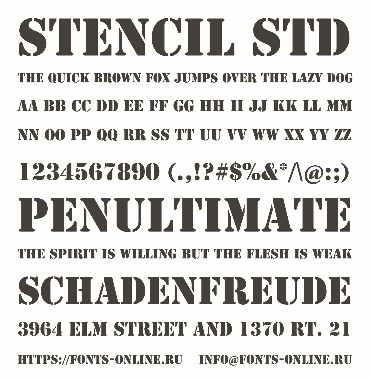Stencil Std PinterestFacebookTwitter Скачать Stencil Std Тестировать Stencil Std Сообщить об ошибке Шрифт Stencil Std. Гарнитура содержит 1 файл и поддерживает 41 язык. Copyright © 1987, 1990, 1994, 2001, 2002 Adobe Systems Incorporated. All rights reserved. Дополнительная информация Категории Современные шрифты Тематические шрифты Армейские шрифты Трафаретные шрифты Шрифты для заголовков Шрифты для текста Шрифты с засечками Языки Албанский Английский Африкаанс Баскский Бретонский Букмол Волапюк Галисийский Датский Зулу Индонезийский Ирландский Исландский Испанский Итальянский Каталанский Кечуанский Корнский Люксембургский Малагасийский Мэнский Немецкий Нидерландский Новонорвежский Оромо Португальский Романшский Руанда Рунди Санго Северный ндебеле Сомалийский Суахили Узбекский Фарерский Финский Французский Шведский Шона Шотландский Эстонский