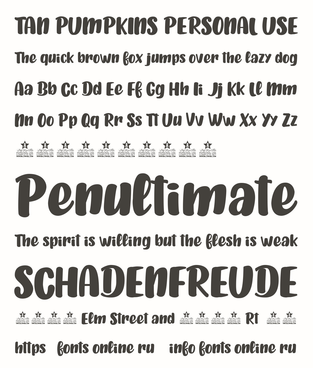 Шрифт TAN PUMPKINS PERSONAL USE. Гарнитура содержит 2 файла и поддерживает 40 языков. Можно использовать в не коммерческой деятельности. Разработка TAN PUMPKINS PERSONAL USE велась Billy Argel.
