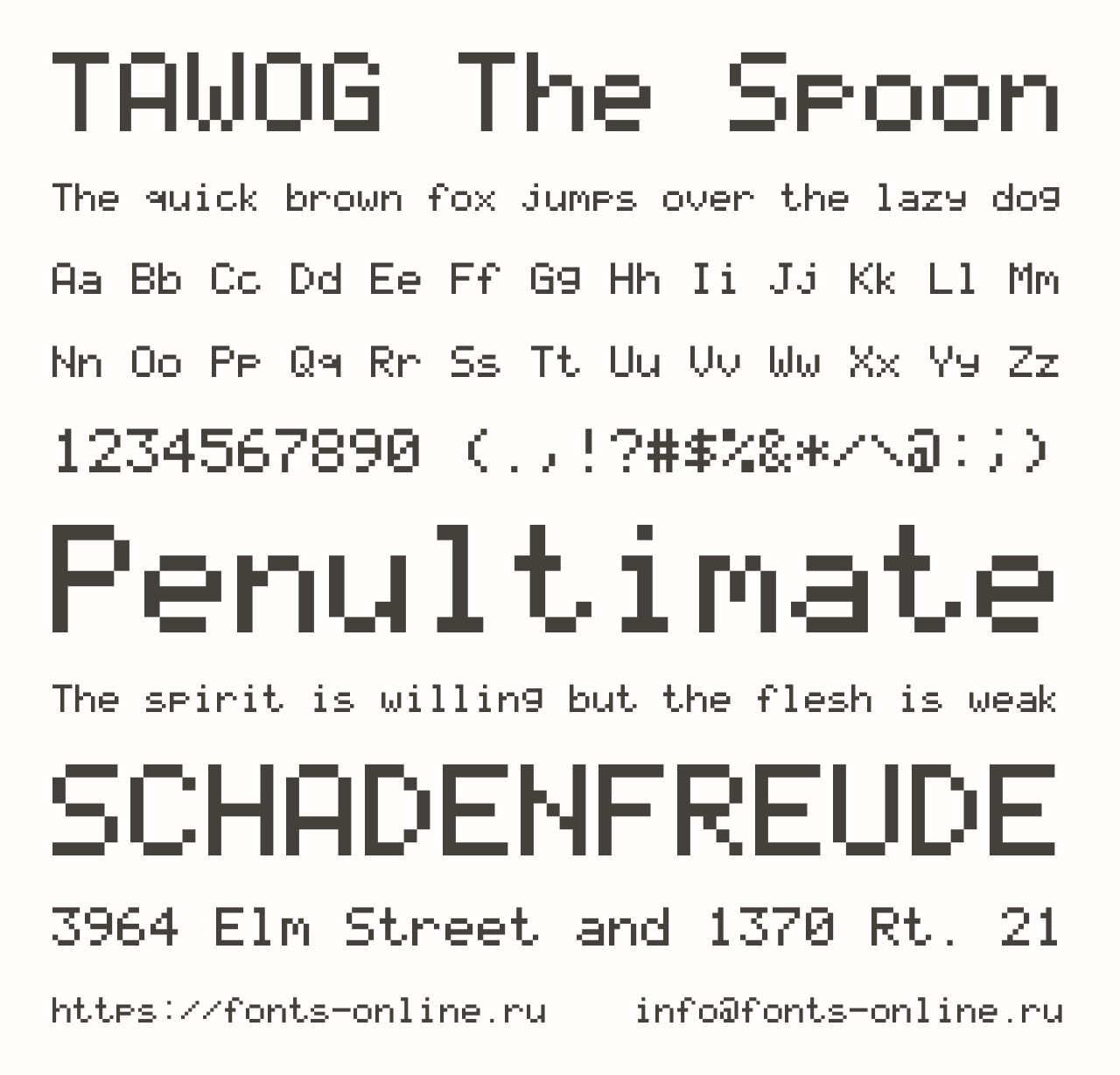 Шрифт TAWOG The Spoon. Гарнитура содержит 1 файл и поддерживает 58 языков. Лицензия GNU GPL 3.0. Можно использовать в коммерческой и не коммерческой деятельности.