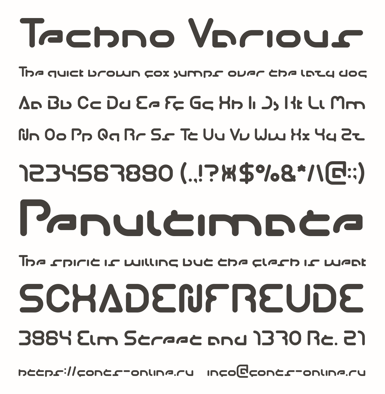 Шрифт Techno Various. Гарнитура содержит 8 файлов и поддерживает 37 языков. Можно использовать в не коммерческой деятельности.