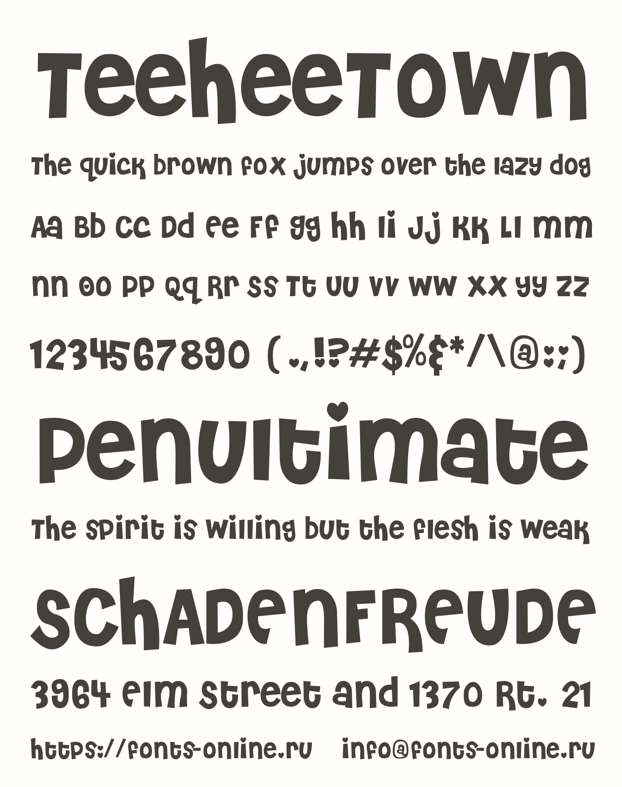 TeeheeTown PinterestFacebookTwitter Скачать TeeheeTown Тестировать TeeheeTown Сообщить об ошибке Шрифт TeeheeTown. Гарнитура содержит 1 файл и поддерживает 41 язык. Copyright Teehee Town ©1998, Élise Benoît Fonts. Дополнительная информация Категории Декоративные шрифты Дизайнерские шрифты Красивые шрифты Художественные шрифты Праздничные шрифты День святого Валентина Комические шрифты Тематические шрифты Шрифты без засечек Шрифты для заголовков Языки Албанский Английский Африкаанс Баскский Бретонский Букмол Волапюк Галисийский Датский Зулу Индонезийский Ирландский Исландский Испанский Итальянский Каталанский Кечуанский Корнский Люксембургский Малагасийский Мэнский Немецкий Нидерландский Новонорвежский Оромо Португальский Романшский Руанда Рунди Санго Северный ндебеле Сомалийский Суахили Узбекский Фарерский Финский Французский Шведский Шона Шотландский Эстонский