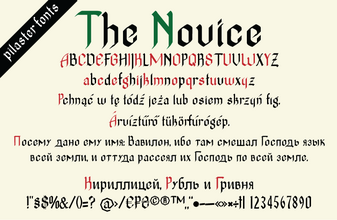 Шрифт TheNovice. Гарнитура содержит 1 файл и поддерживает 66 языков. Можно использовать в не коммерческой деятельности. Разработка TheNovice велась Pilaster Davy.