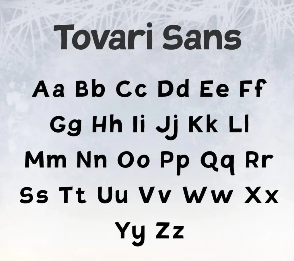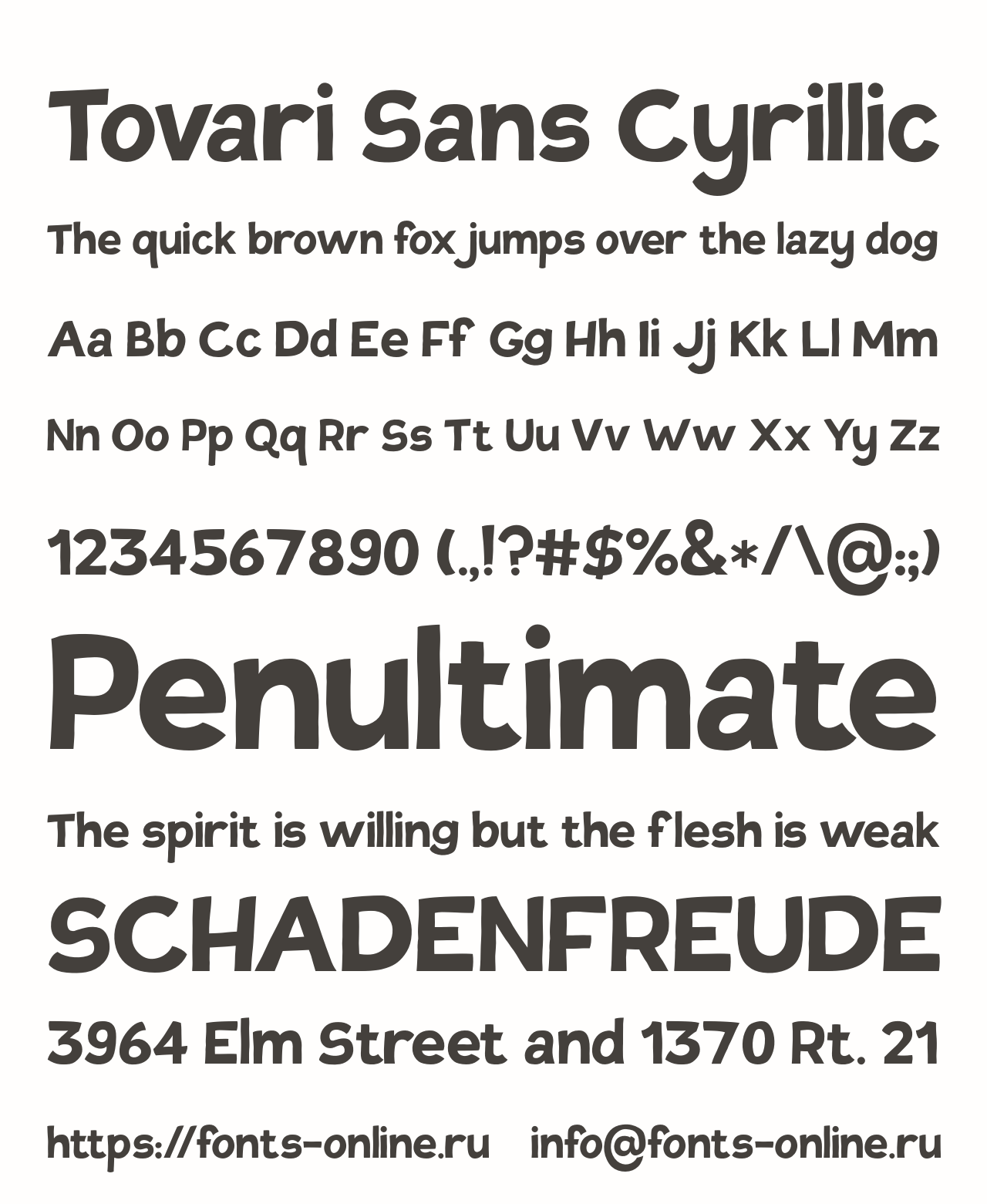 Шрифт Tovari Sans Cyrillic. Гарнитура содержит 3 файла и поддерживает 41 язык. Лицензия SIL OFL 1.1. Можно использовать в коммерческой и не коммерческой деятельности. Разработка Tovari Sans Cyrillic велась Denis Ignatov, Verneri Kontto.