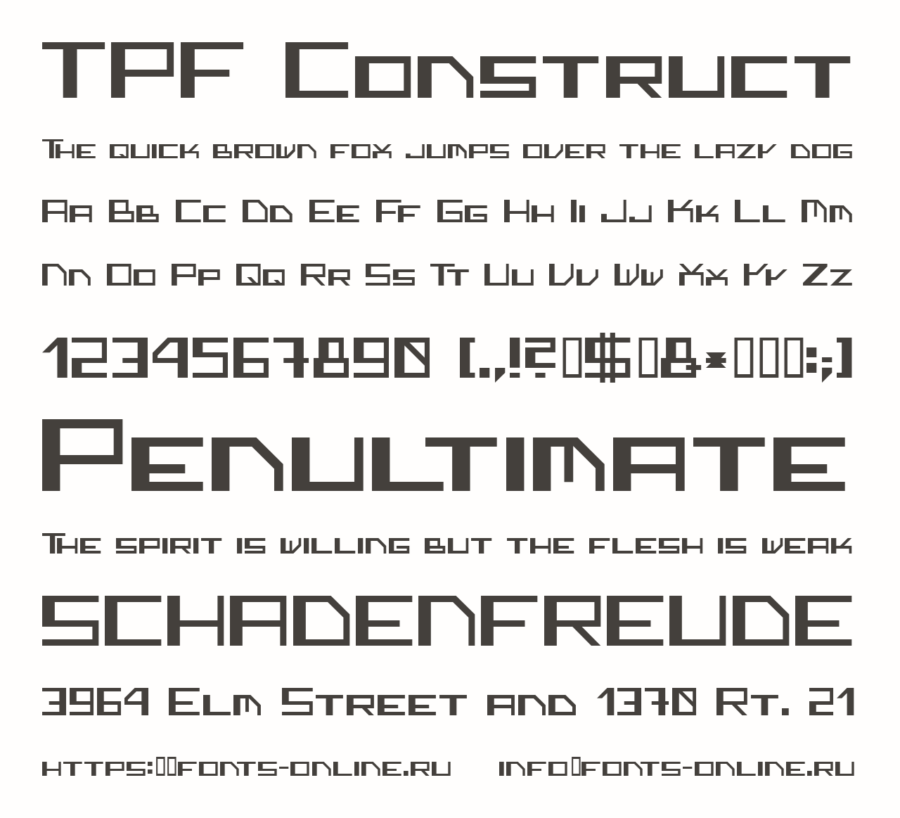 Шрифт TPF Construct. Гарнитура содержит 1 файл и поддерживает 12 языков. Можно использовать в не коммерческой деятельности.