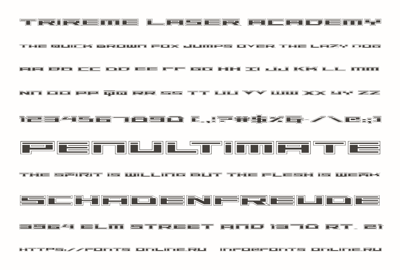 Шрифт Trireme Laser Academy. Гарнитура содержит 21 файл и поддерживает 41 язык. Можно использовать в не коммерческой деятельности. Разработка Trireme Laser Academy велась Iconian Fonts.