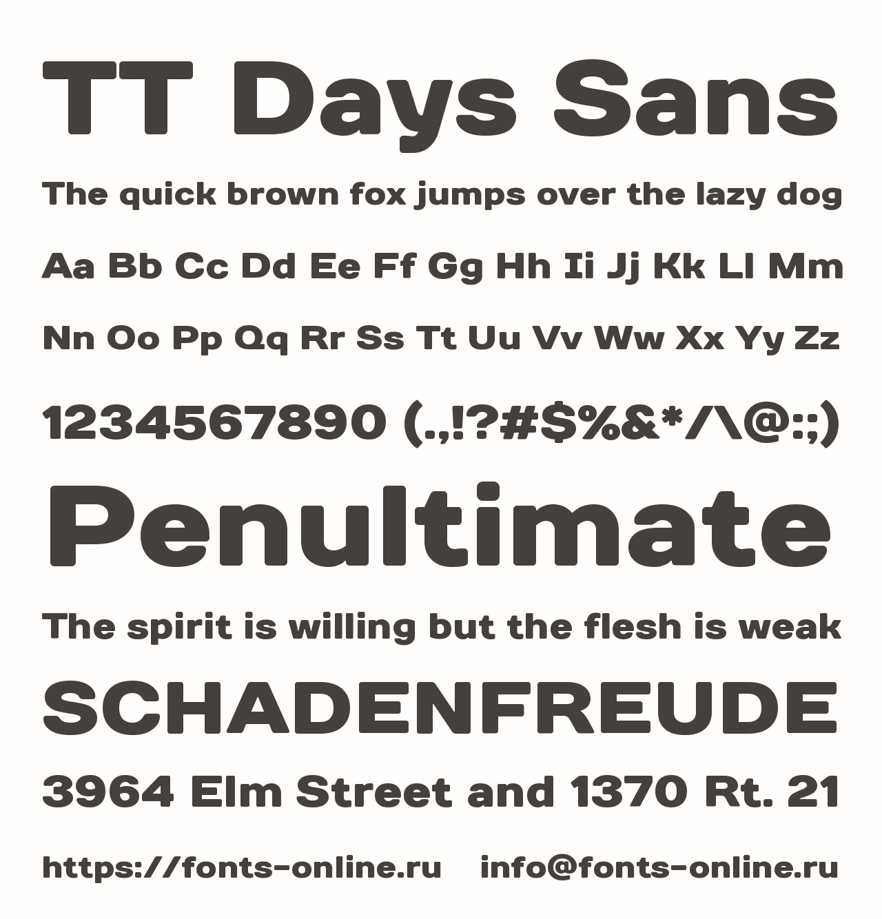 Шрифт TT Days Sans. Гарнитура содержит 10 файлов и поддерживает 58 языков. Разработка TT Days Sans велась TypeType.