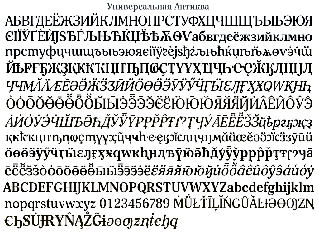 Шрифт Universal Antiqua. Гарнитура содержит 4 файла и поддерживает 72 языка. Можно использовать в не коммерческой деятельности. Разработка Universal Antiqua велась Alexandra Gophmann.